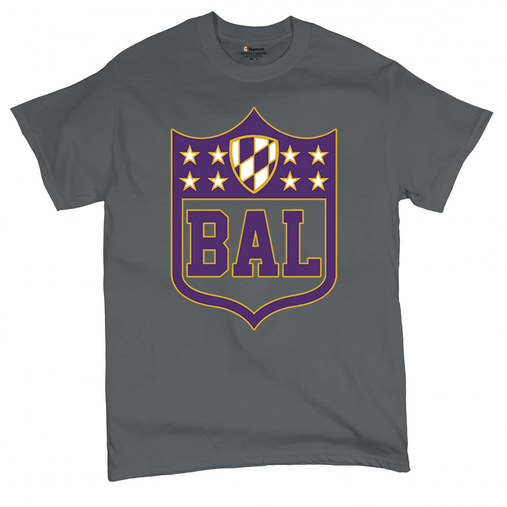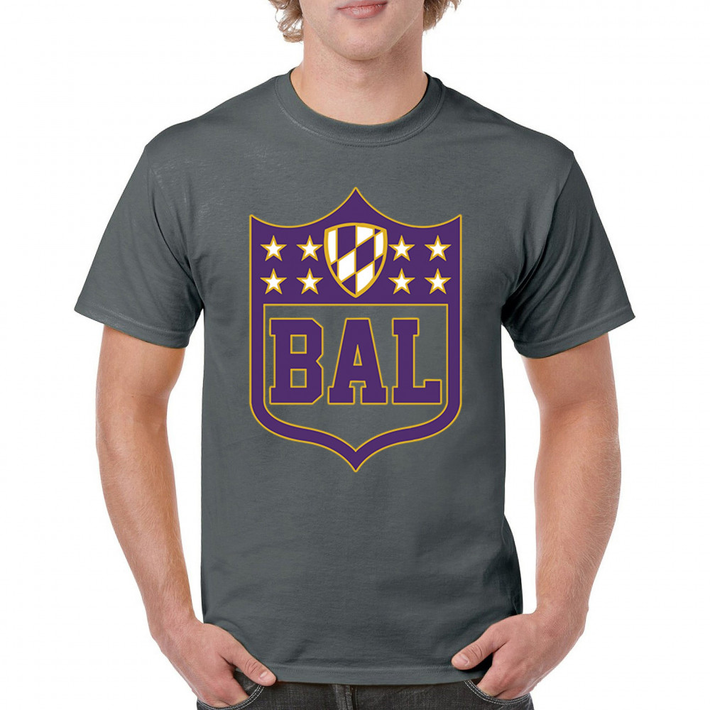 Bold BAL shield design for Baltimore football fans. Vintage sports shirt, collegiate style, and perfect Game Day Baltimore tee.