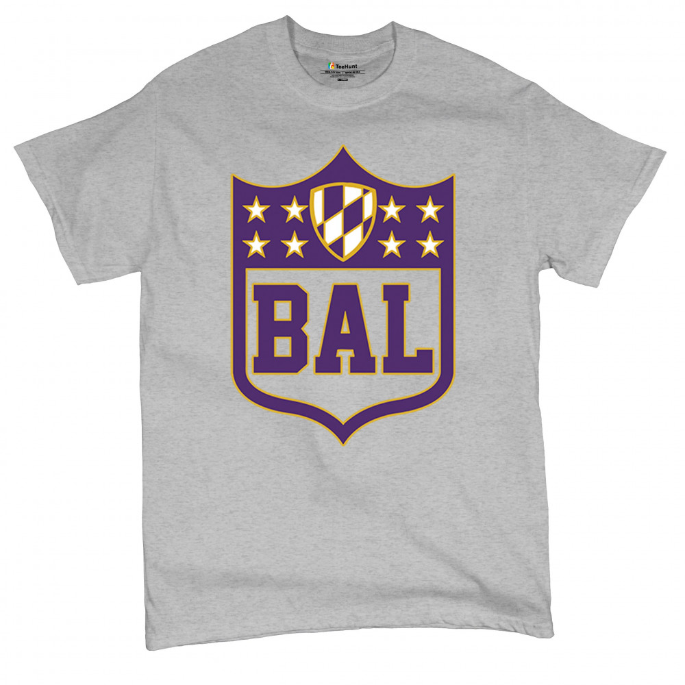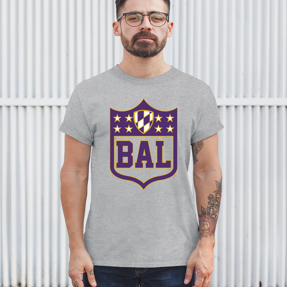 Bold BAL shield design for Baltimore football fans. Vintage sports shirt, collegiate style, and perfect Game Day Baltimore tee.