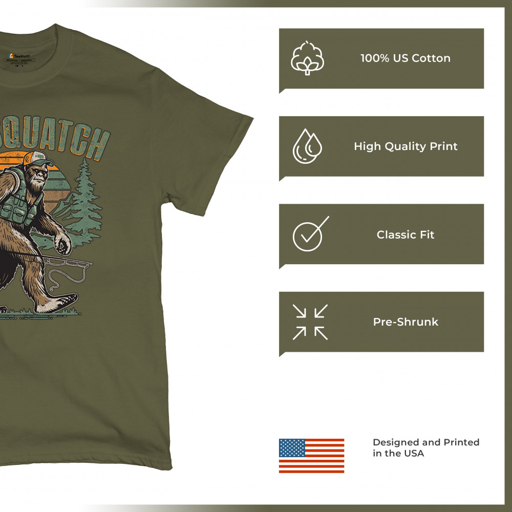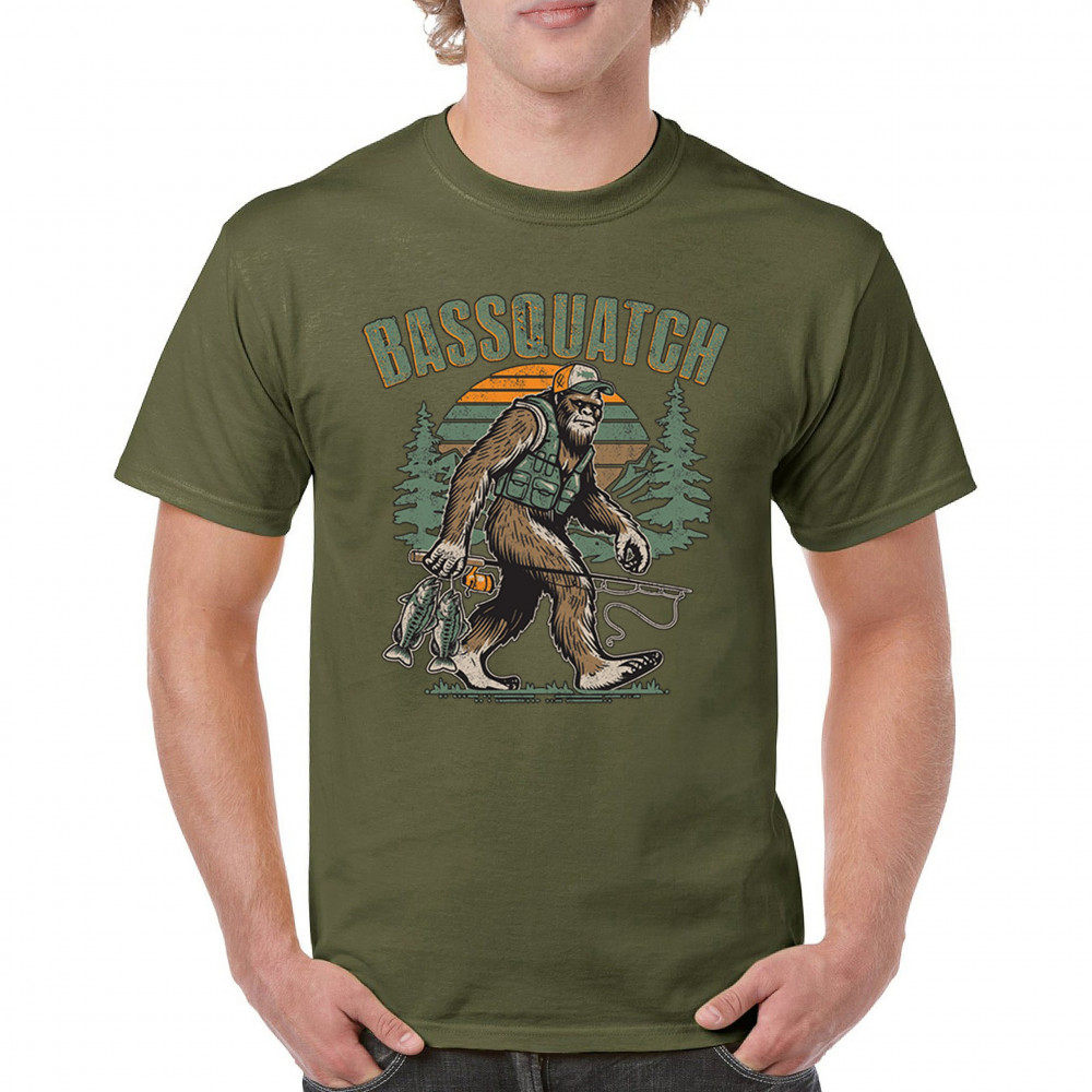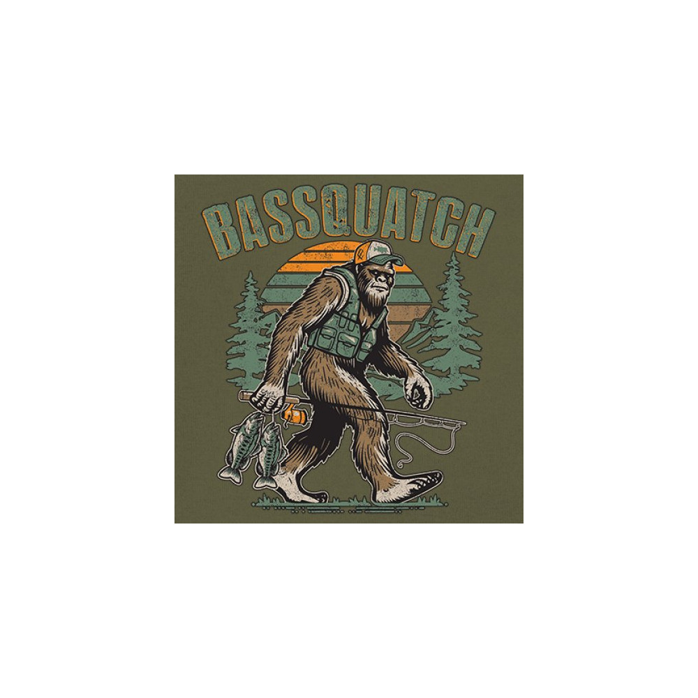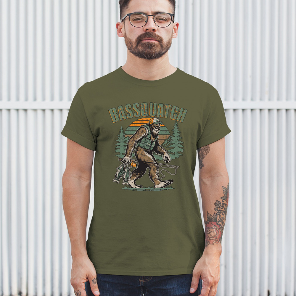 Funny Bassquatch design blends Bigfoot, fishing humor, and retro forest style. Great for anglers, cryptid lovers, and outdoorsy pun fans.