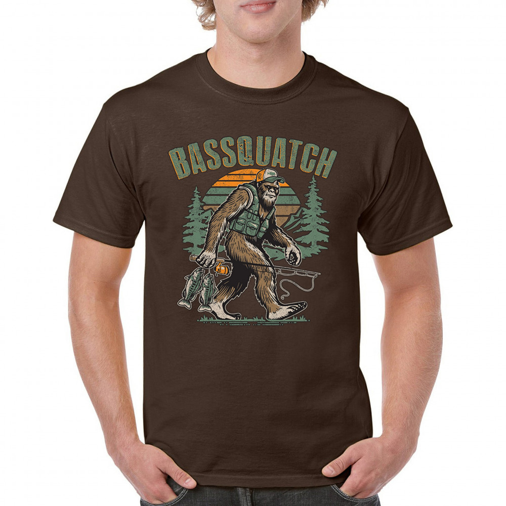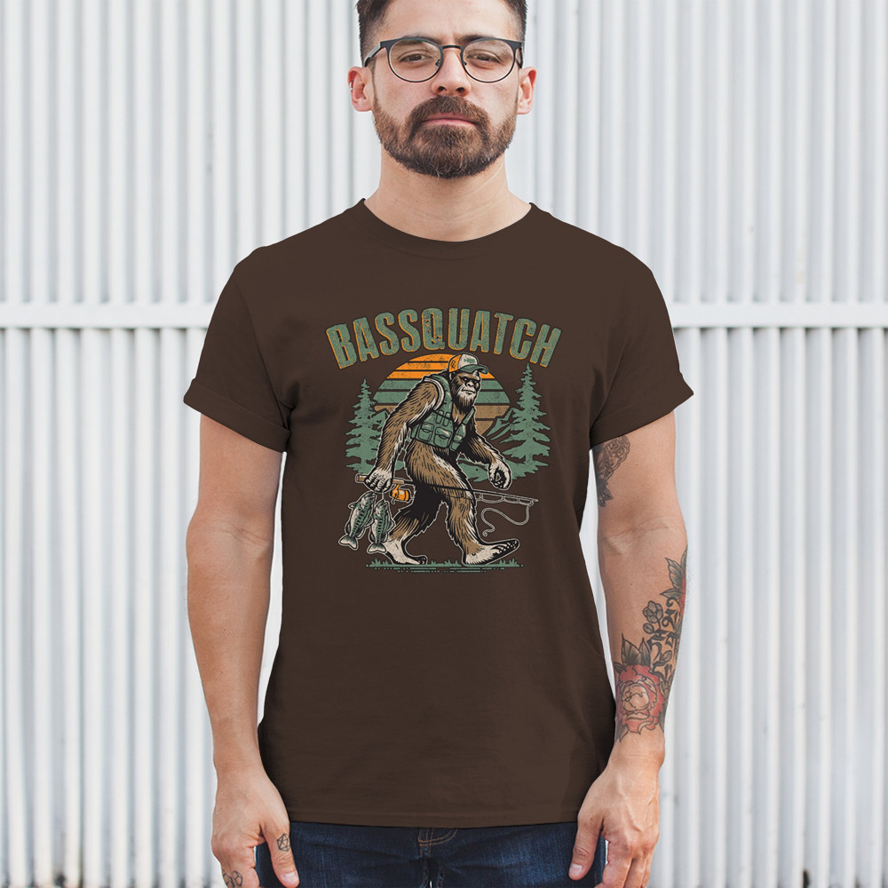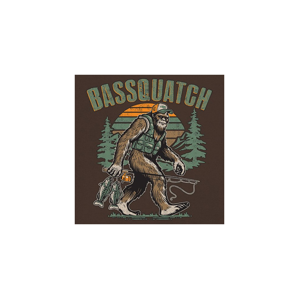 Funny Bassquatch design blends Bigfoot, fishing humor, and retro forest style. Great for anglers, cryptid lovers, and outdoorsy pun fans.