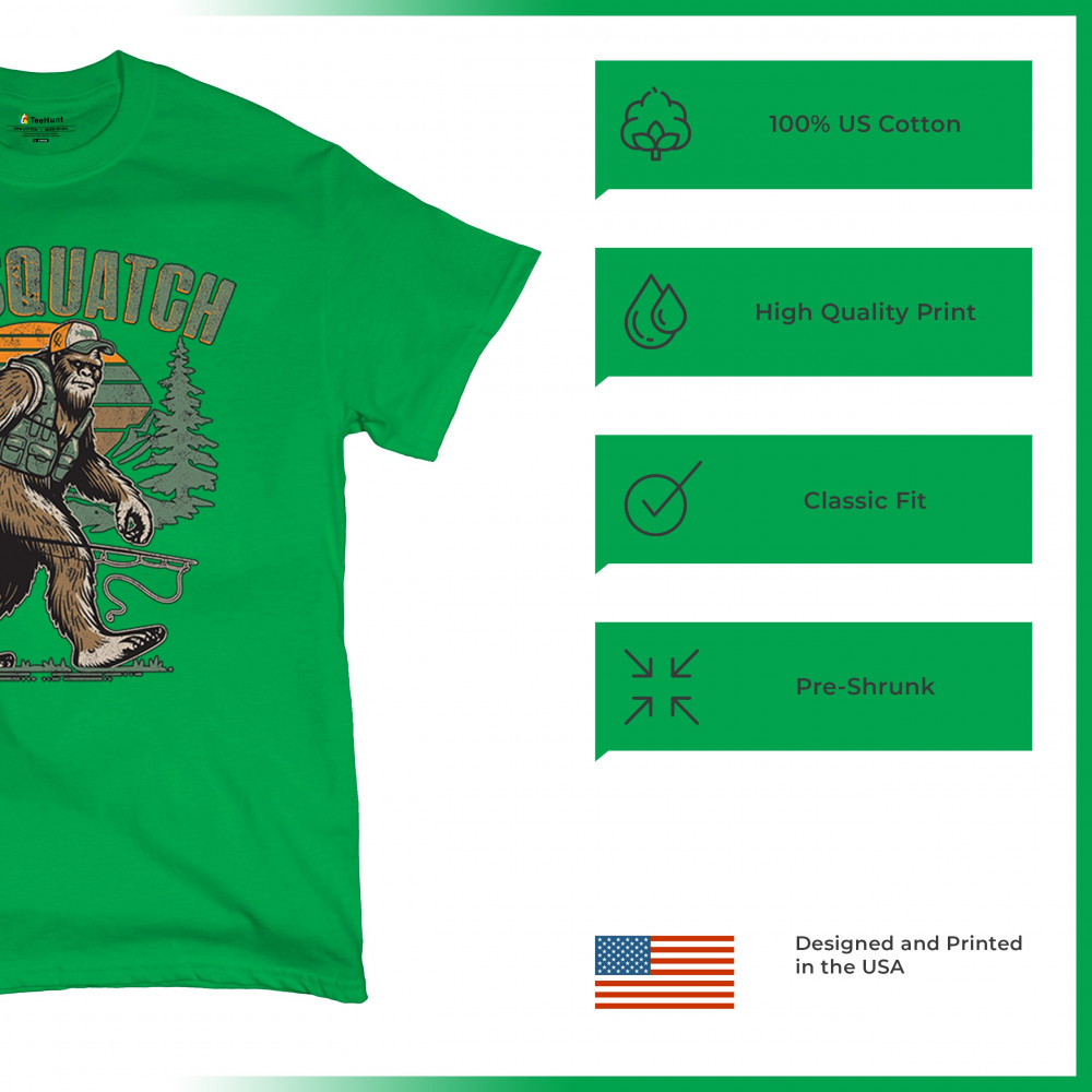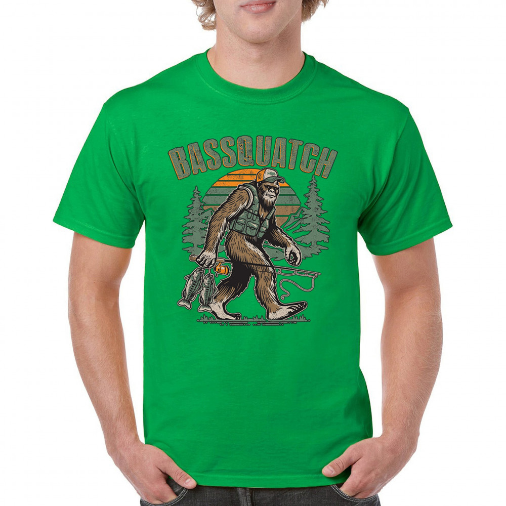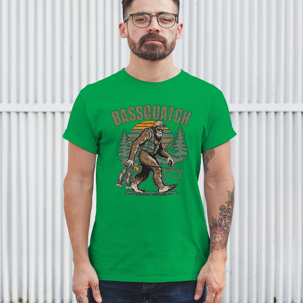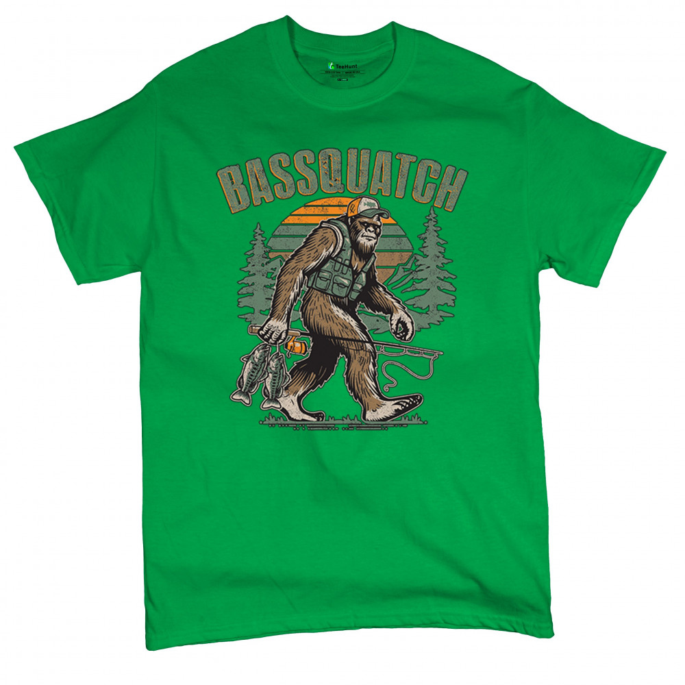 Funny Bassquatch design blends Bigfoot, fishing humor, and retro forest style. Great for anglers, cryptid lovers, and outdoorsy pun fans.