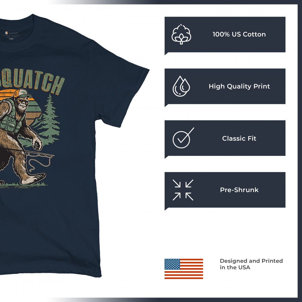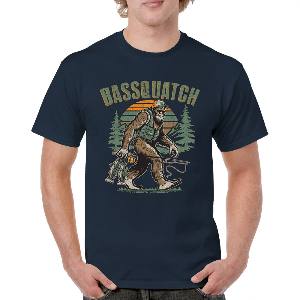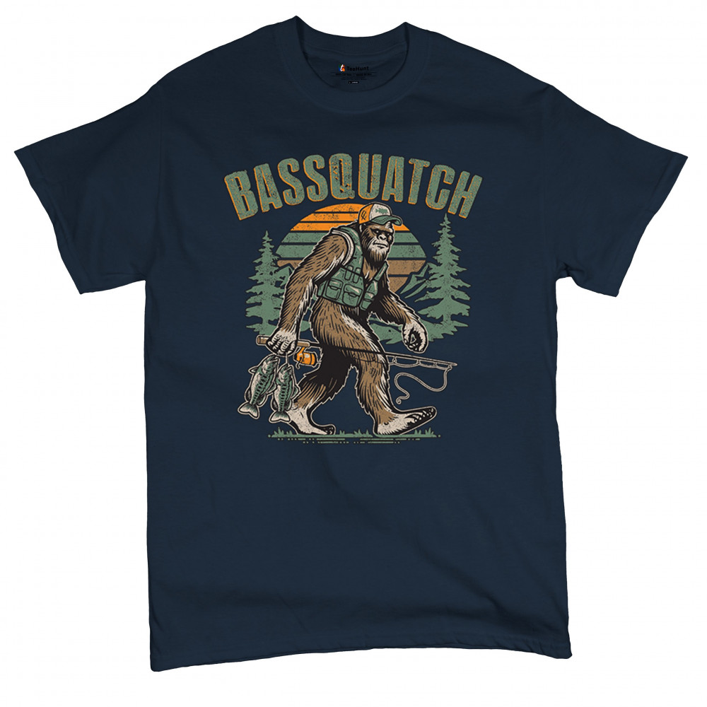Funny Bassquatch design blends Bigfoot, fishing humor, and retro forest style. Great for anglers, cryptid lovers, and outdoorsy pun fans.