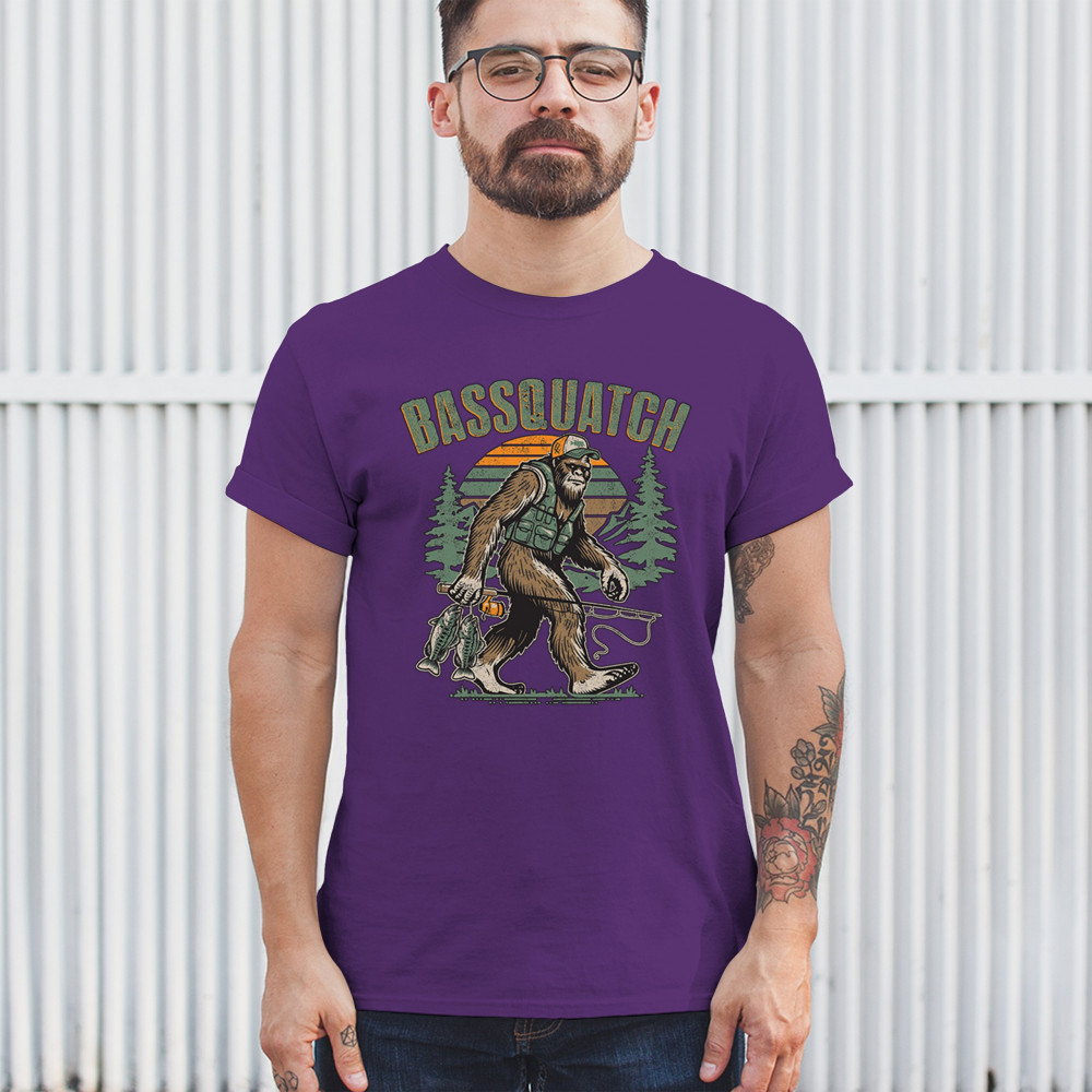 Funny Bassquatch design blends Bigfoot, fishing humor, and retro forest style. Great for anglers, cryptid lovers, and outdoorsy pun fans.
