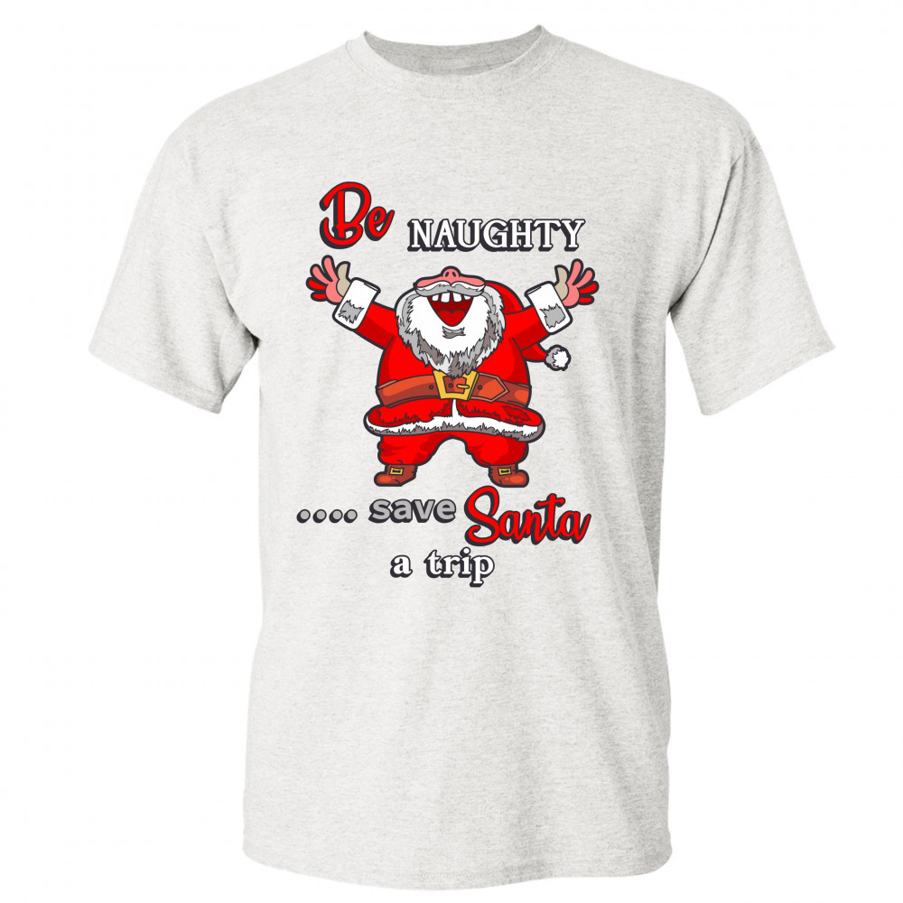 BE NAUGHTY SAVE SANTA A TRIP t-shirt holiday spirit christmas eve men's tee ash gray