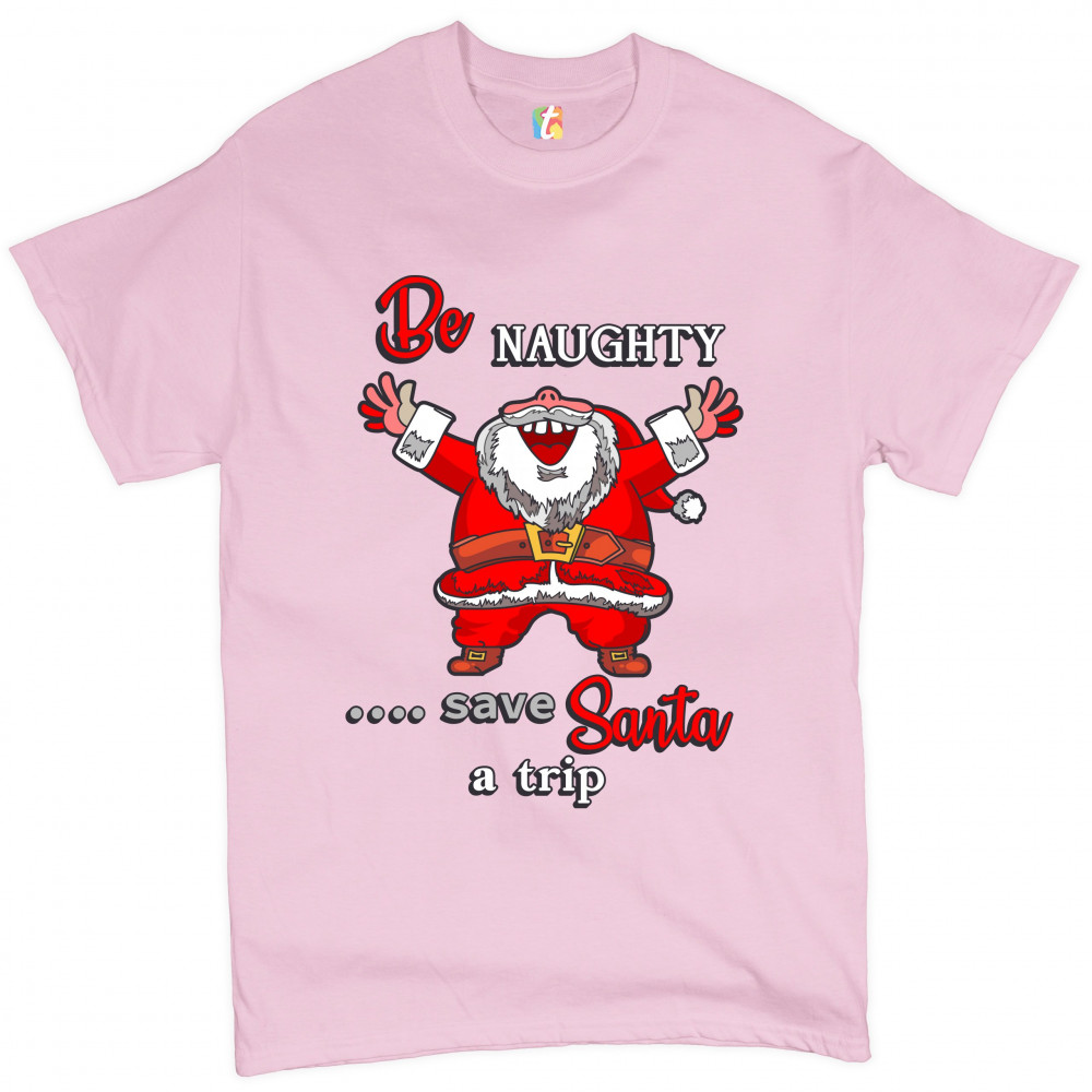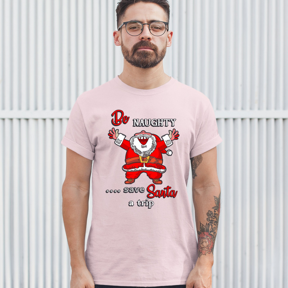 BE NAUGHTY SAVE SANTA A TRIP t-shirt holiday spirit christmas eve men's tee light pink