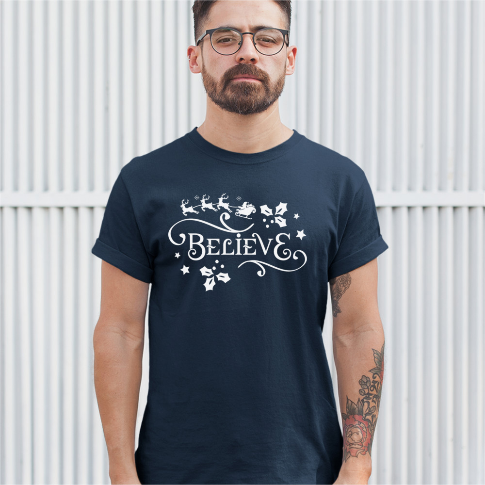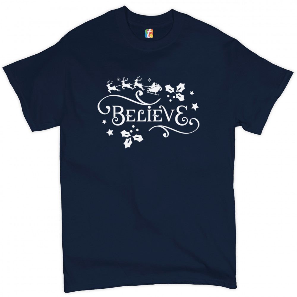 BELIEVE t-shirt merry christmas santa sleigh rudolph mistletoe men's tee navy blue
