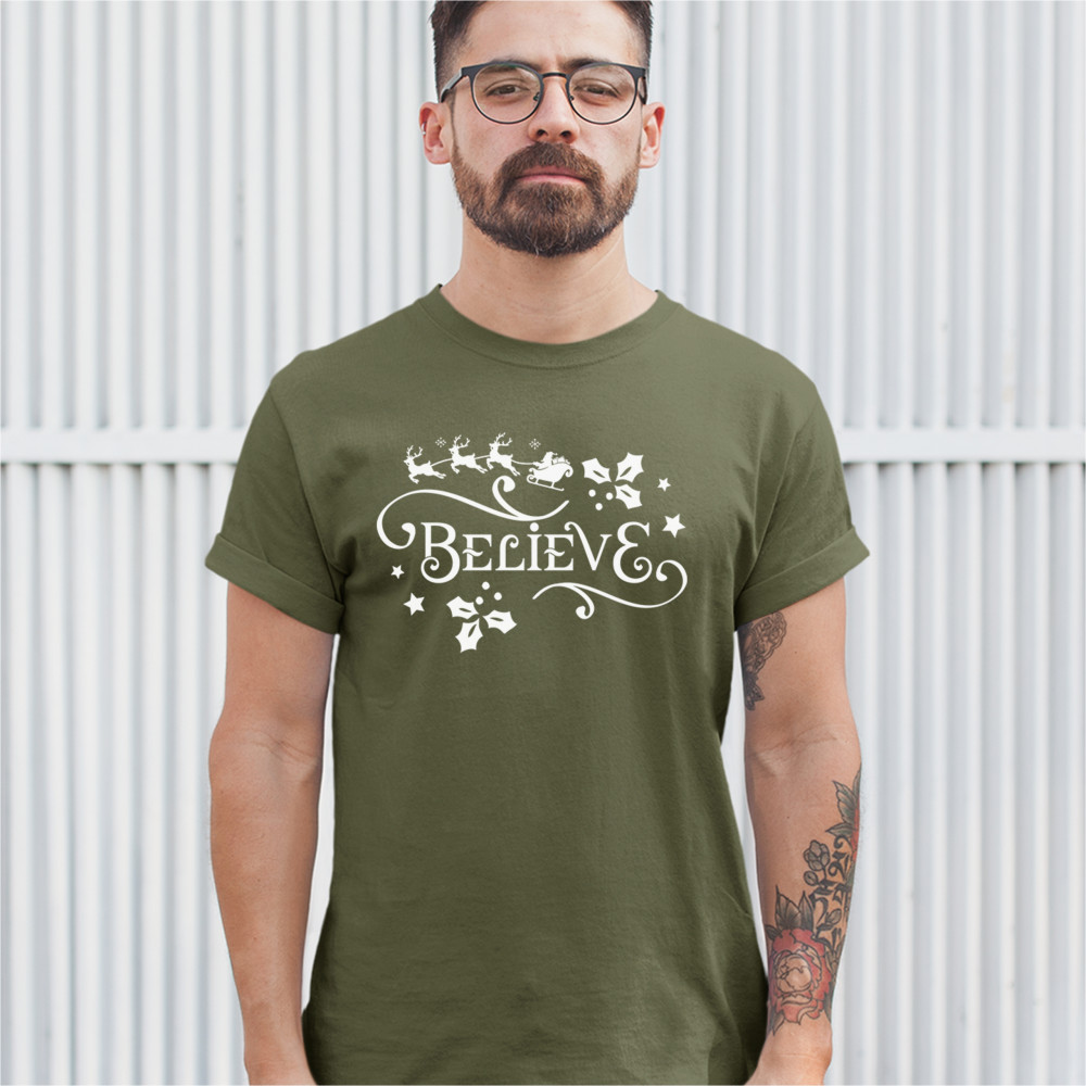 BELIEVE t-shirt merry christmas santa sleigh rudolph mistletoe men's tee military green