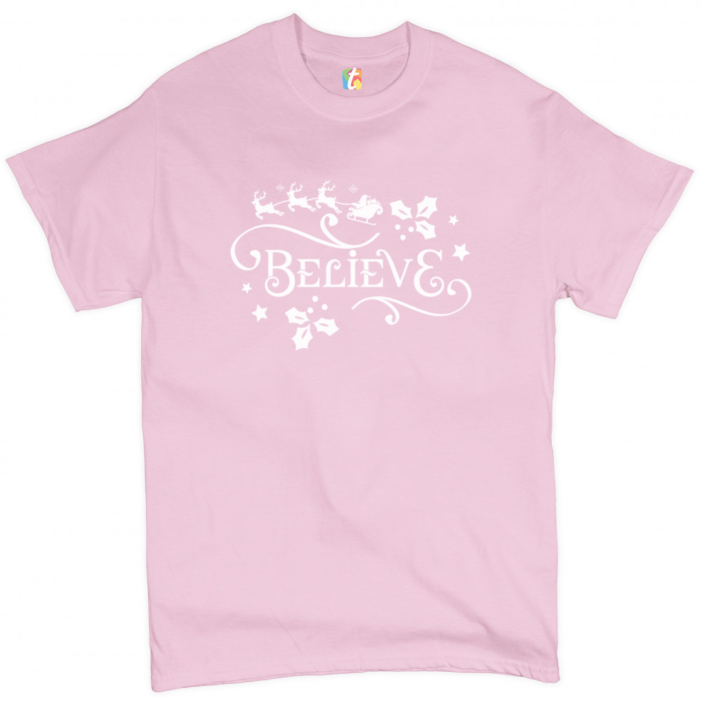 BELIEVE t-shirt merry christmas santa sleigh rudolph mistletoe men's tee light pink