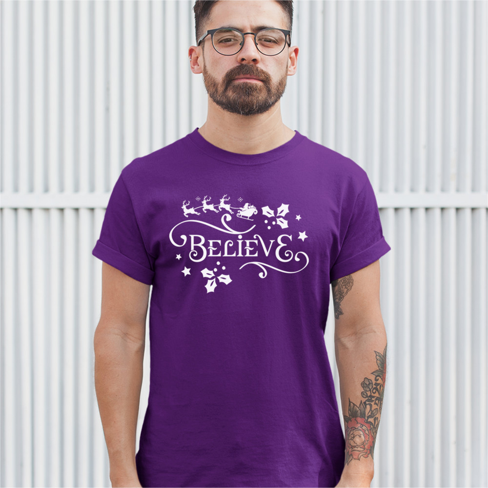 BELIEVE t-shirt merry christmas santa sleigh rudolph mistletoe men's tee purple