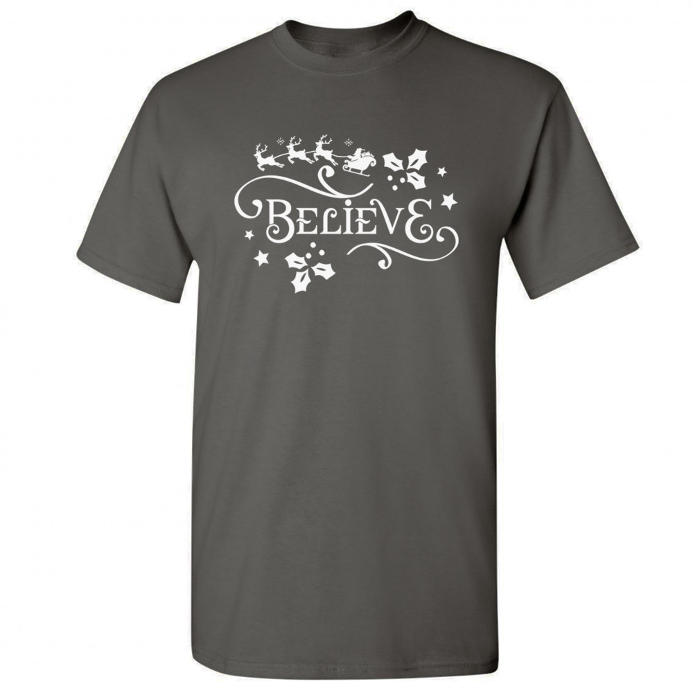 BELIEVE t-shirt merry christmas santa sleigh rudolph mistletoe men's tee charcoal