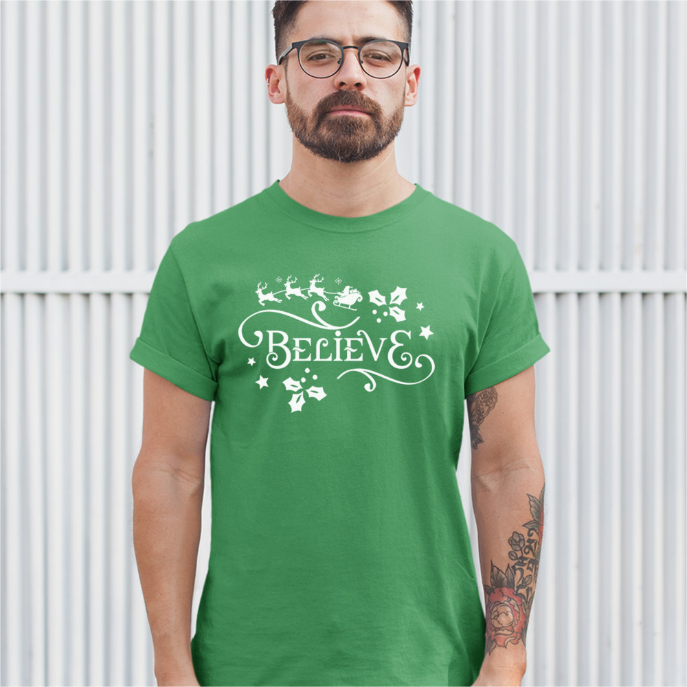 BELIEVE t-shirt merry christmas santa sleigh rudolph mistletoe men's tee green