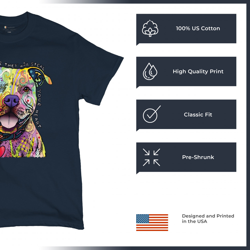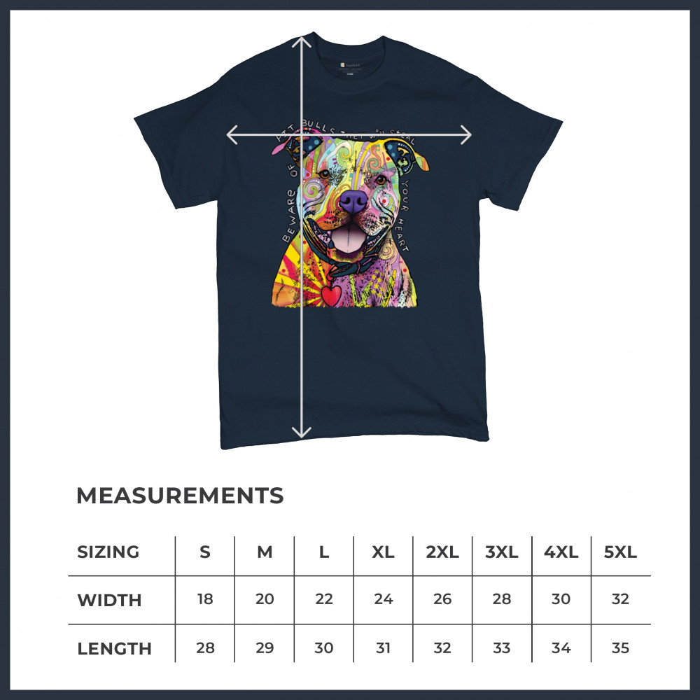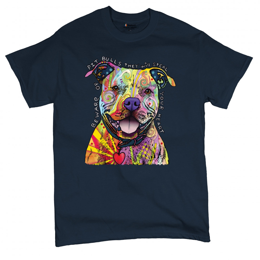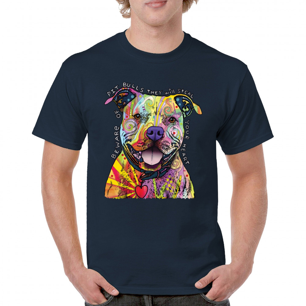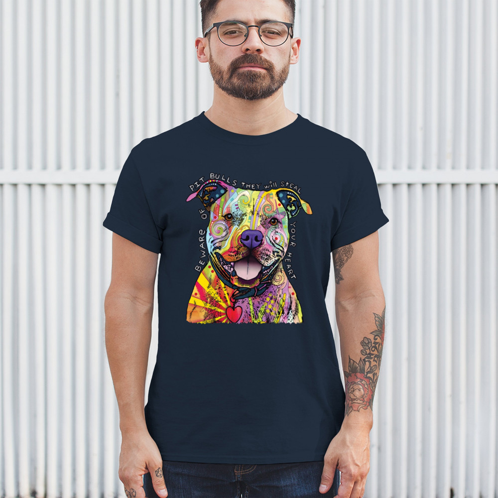 BEWARE OF PIT BULLS t-shirt dean russo art colorful cute dog men's tee navy blue