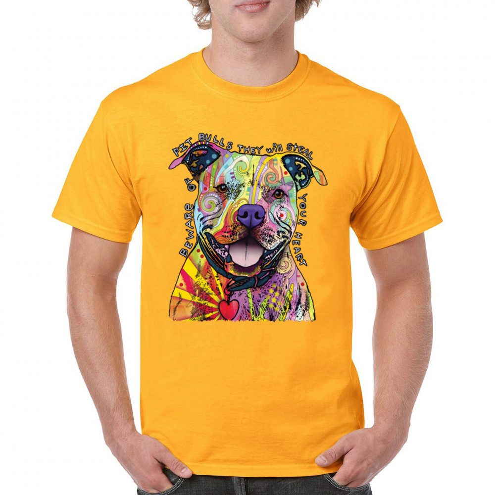 BEWARE OF PIT BULLS t-shirt dean russo art colorful cute dog men's tee yellow