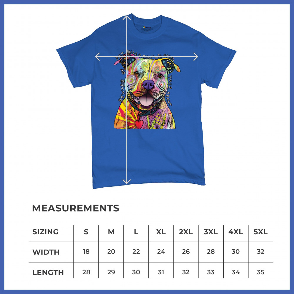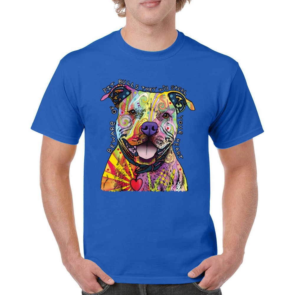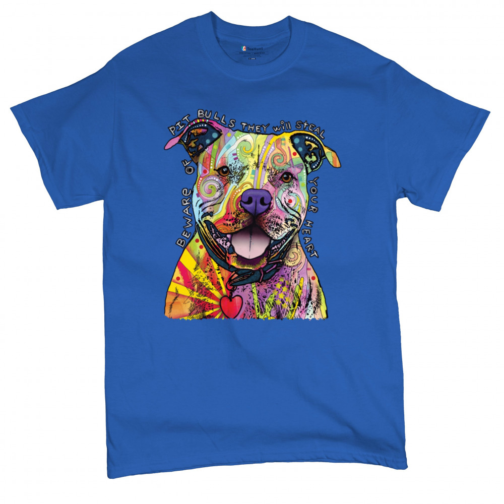 BEWARE OF PIT BULLS t-shirt dean russo art colorful cute dog men's tee royal blue