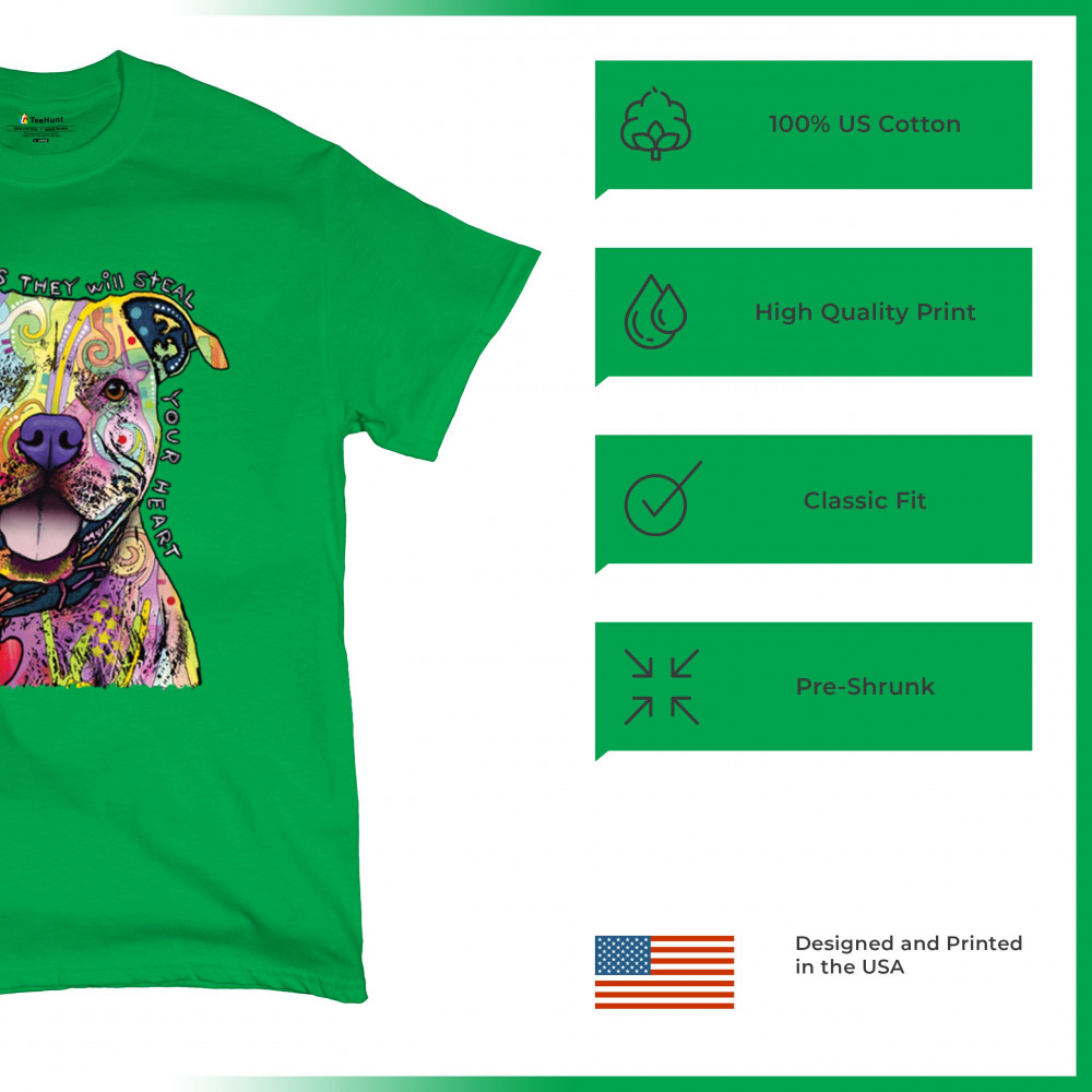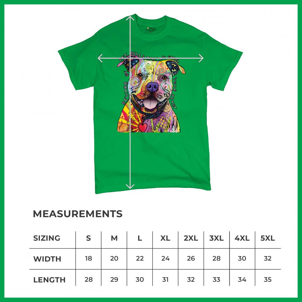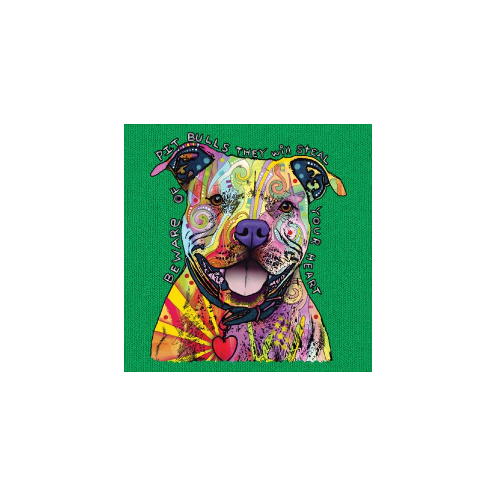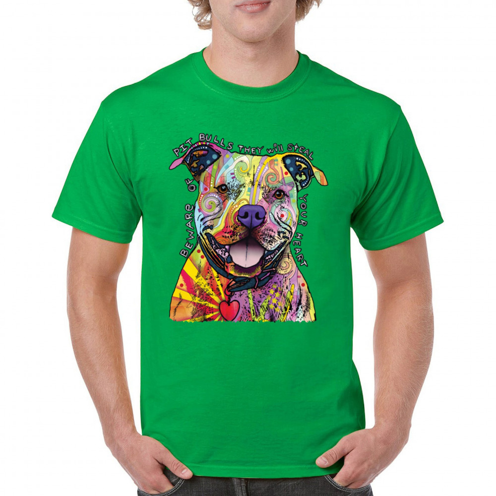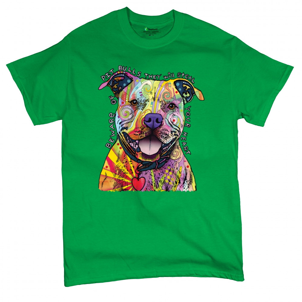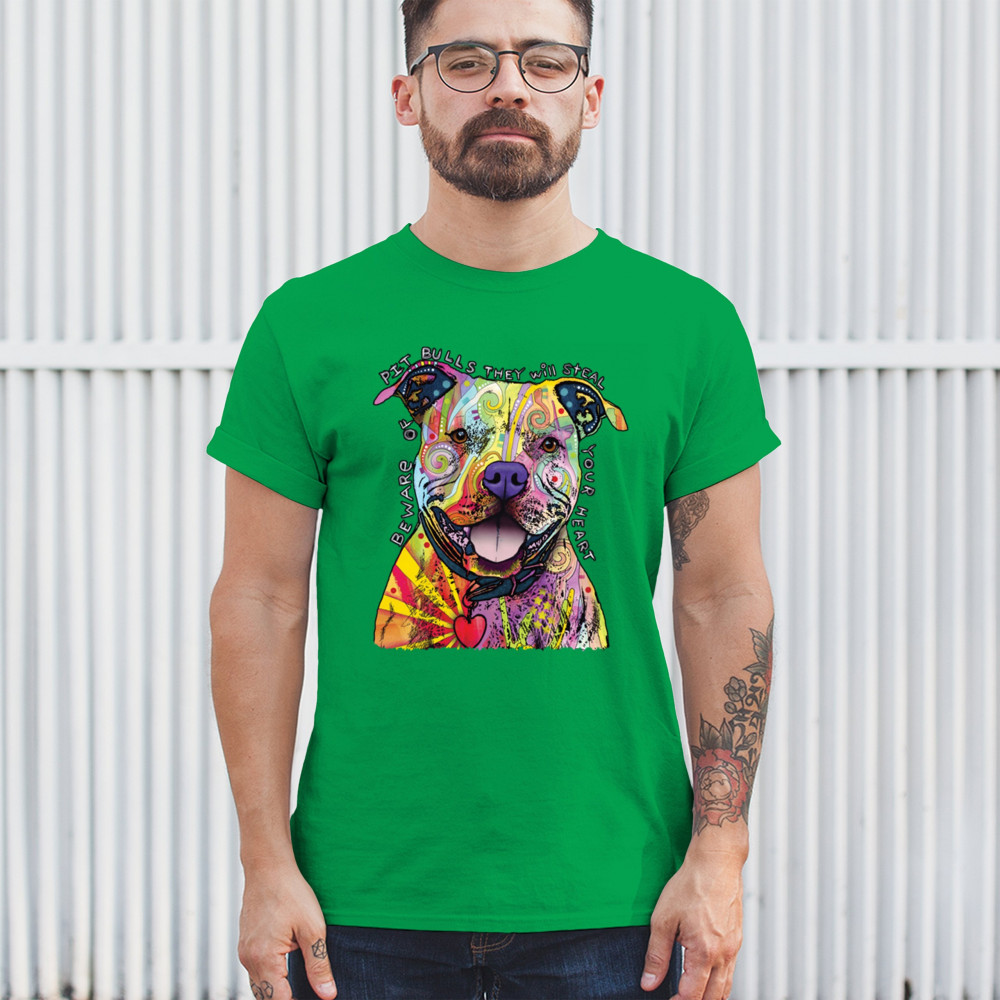 BEWARE OF PIT BULLS t-shirt dean russo art colorful cute dog men's tee green