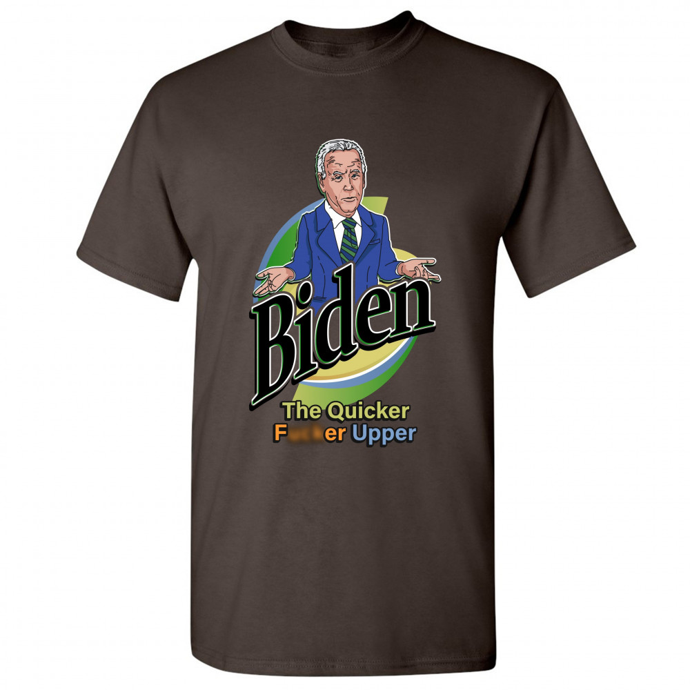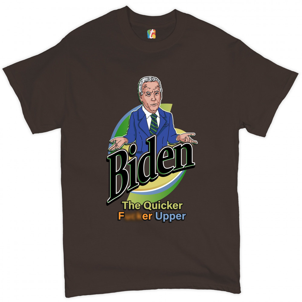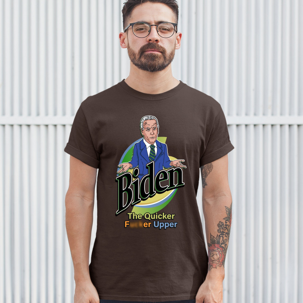 A funny political print featuring a confused Joe Biden shrugging his shoulders and spreading his arms. The print says "Biden the Quicker F*cker Upper". A great choice to wear for a Trump rally or give as a gift to a Donald Trump supporter before 2024 pres
