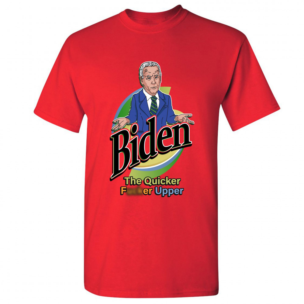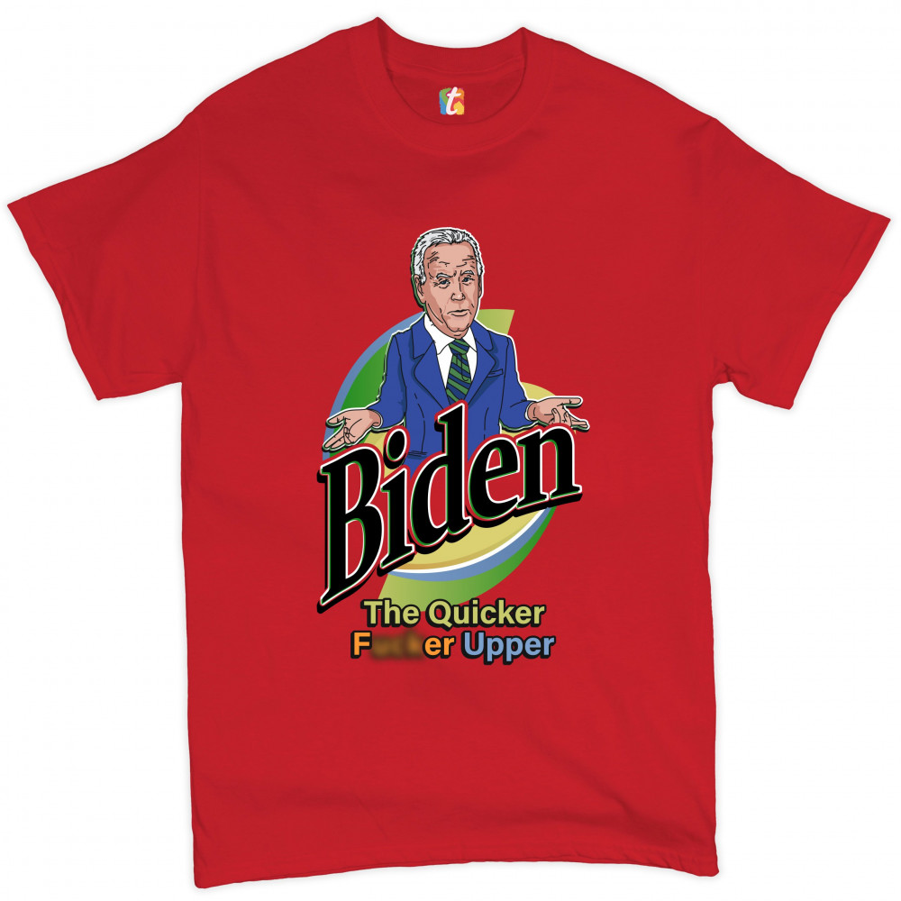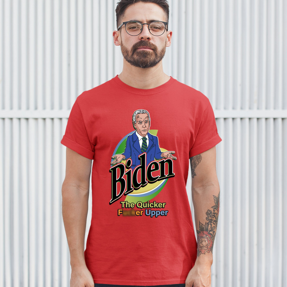 A funny political print featuring a confused Joe Biden shrugging his shoulders and spreading his arms. The print says "Biden the Quicker F*cker Upper". A great choice to wear for a Trump rally or give as a gift to a Donald Trump supporter before 2024 pres