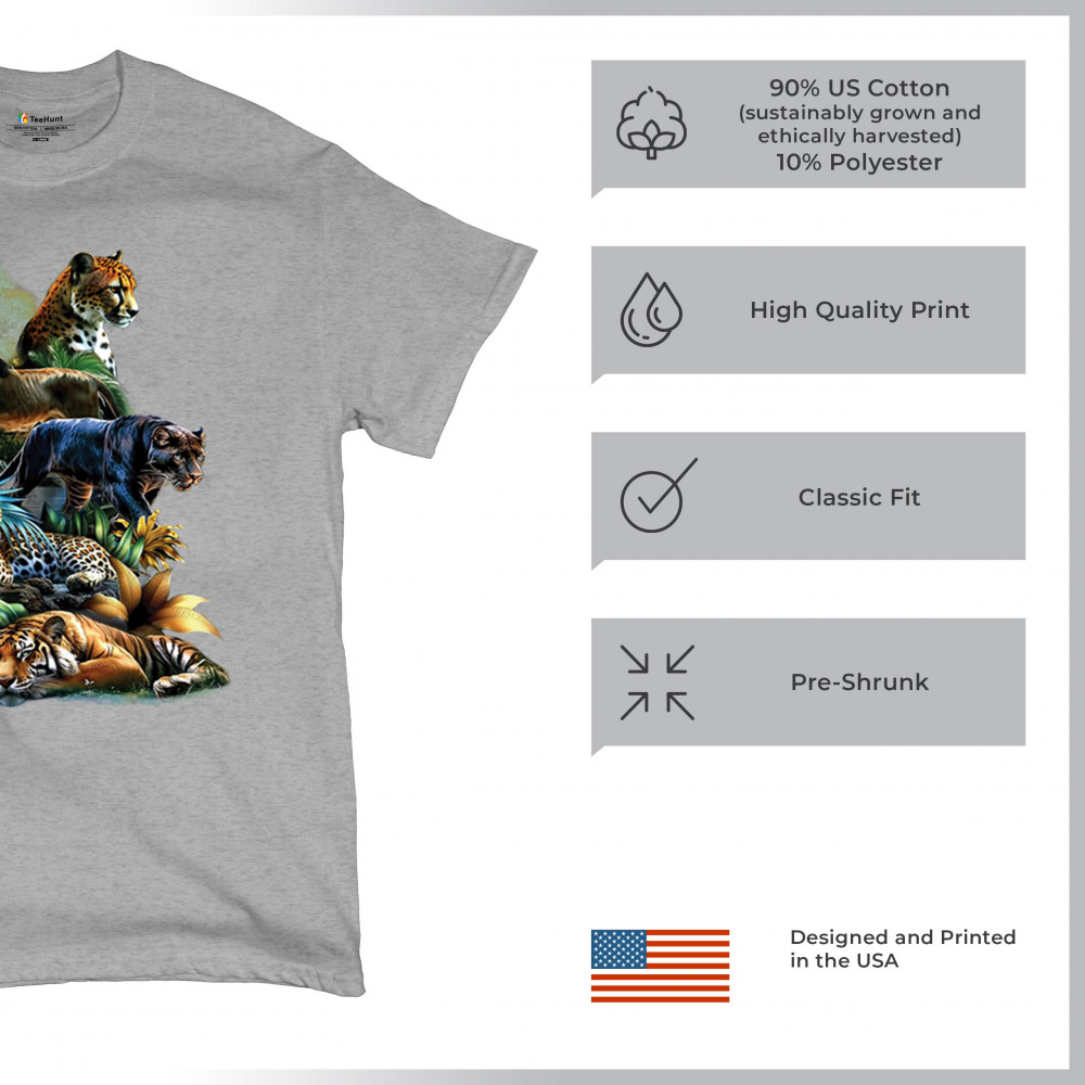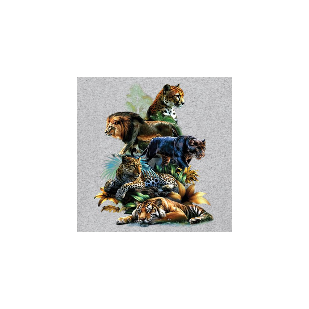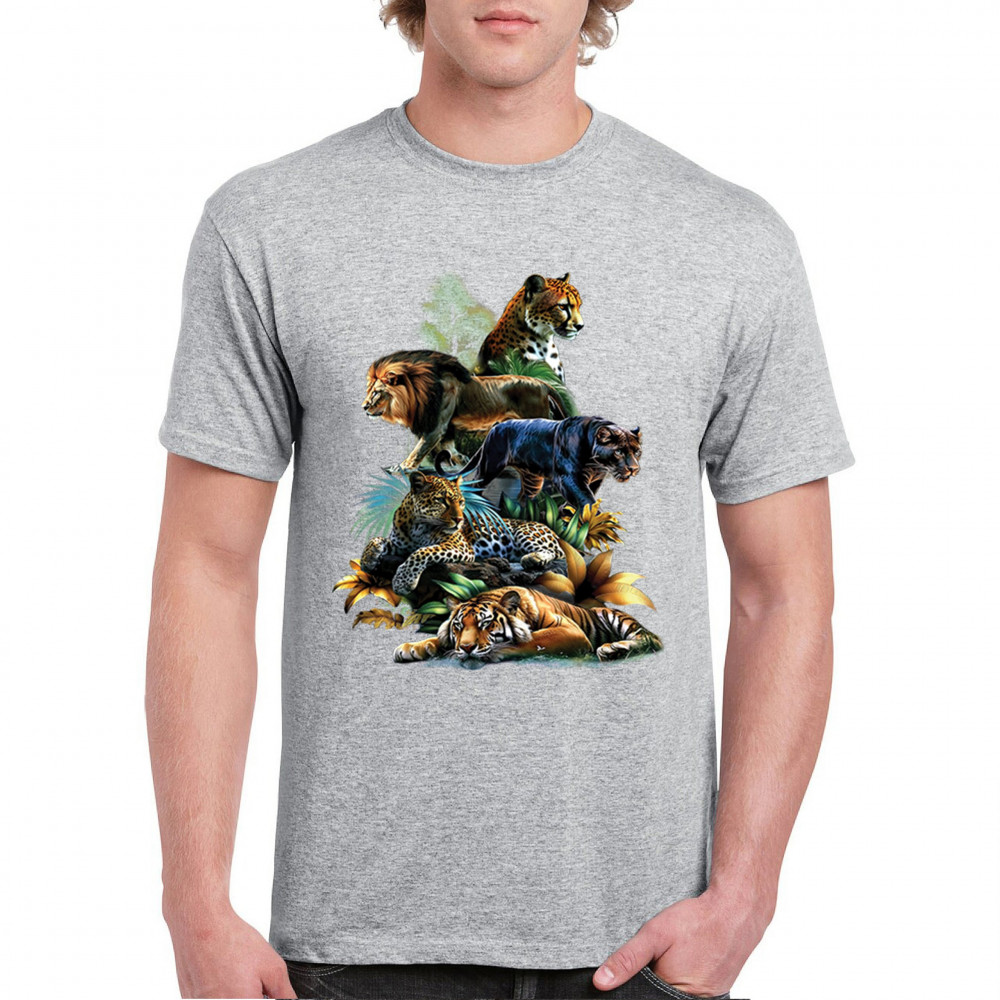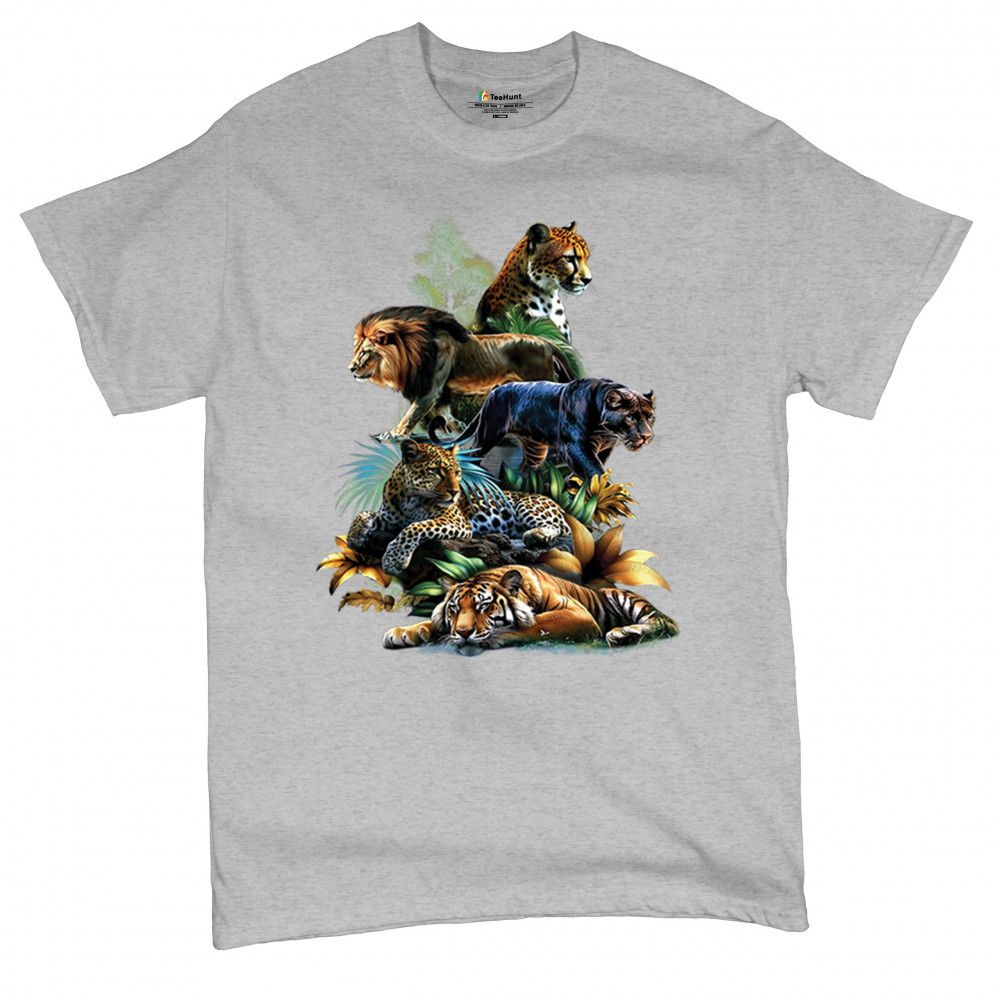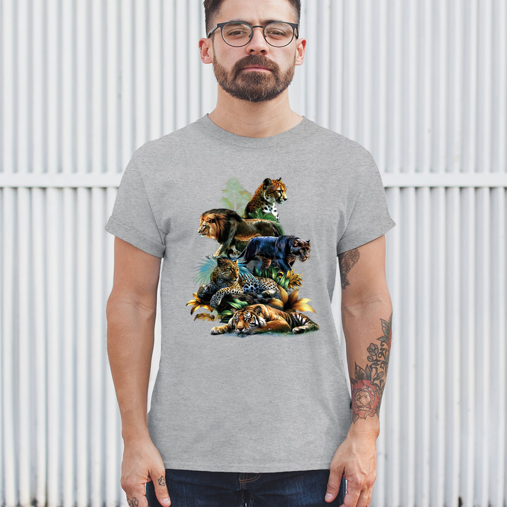 Bold big cat design with lion, tiger, leopard, cheetah, jaguar, and panther. A vivid tribute to wild nature, pride, and animal power.