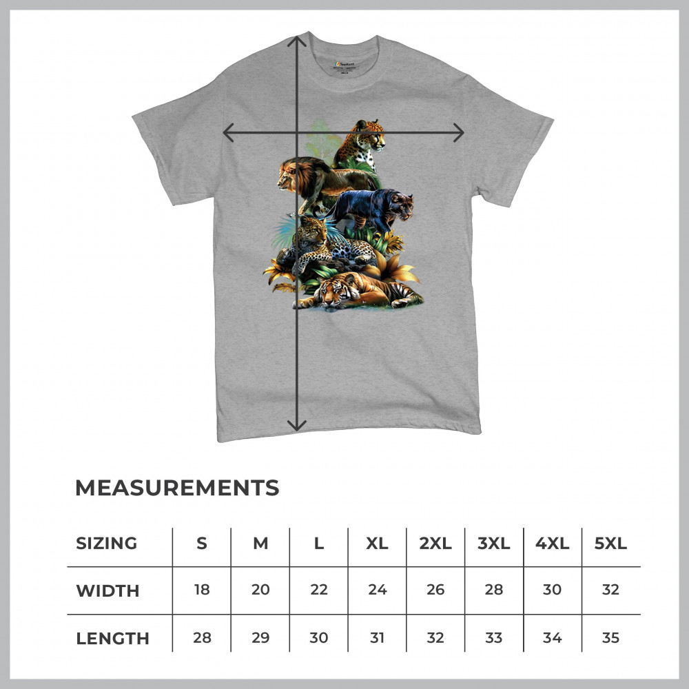 Celebrate raw power and untamed beauty with this stunning big cat design featuring lion, tiger, cheetah, black panther, jaguar, and leopard. Surrounded by vivid jungle foliage, each animal radiates strength, pride, and wild spirit. Perfect for fans of nature, safari vibes, wildlife preservation, and fierce animal energy.