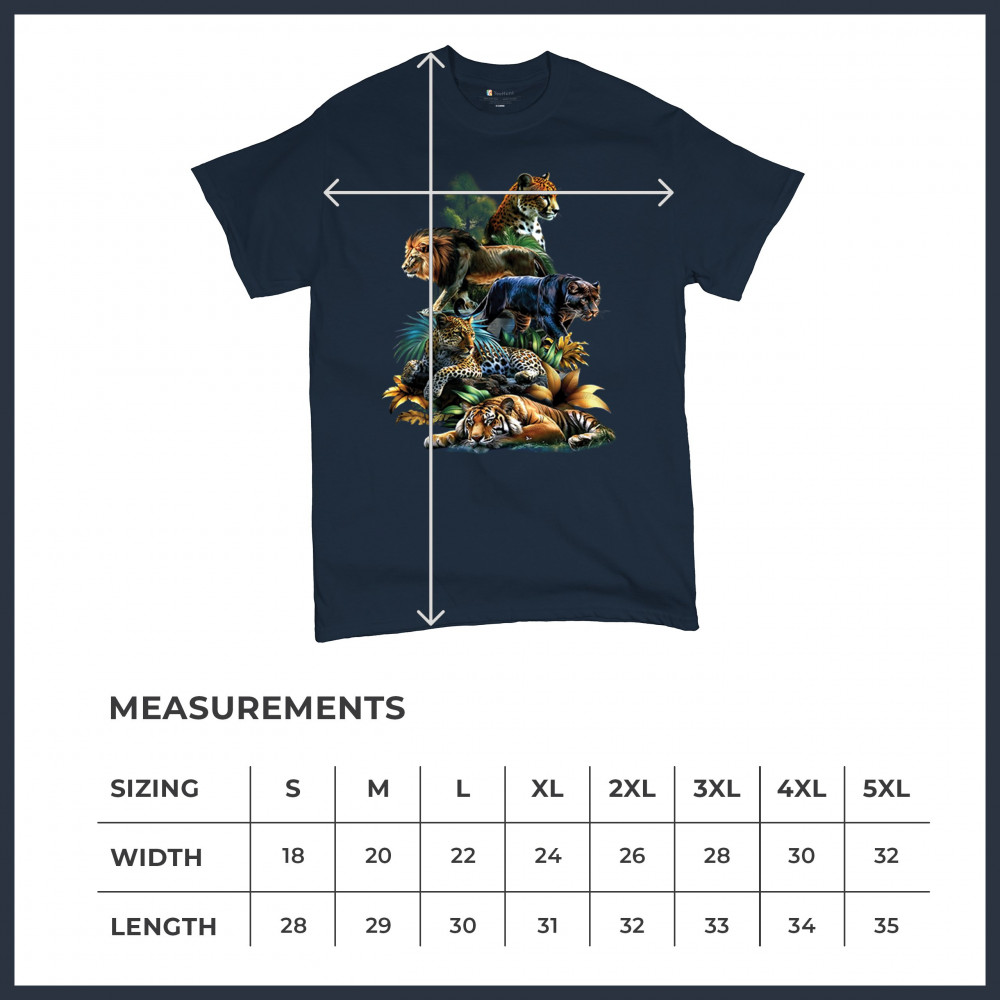 Celebrate raw power and untamed beauty with this stunning big cat design featuring lion, tiger, cheetah, black panther, jaguar, and leopard. Surrounded by vivid jungle foliage, each animal radiates strength, pride, and wild spirit. Perfect for fans of nature, safari vibes, wildlife preservation, and fierce animal energy.