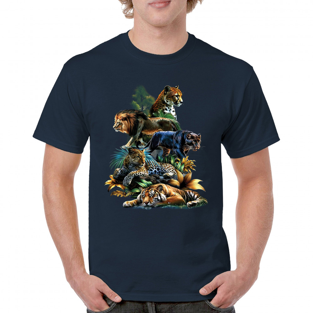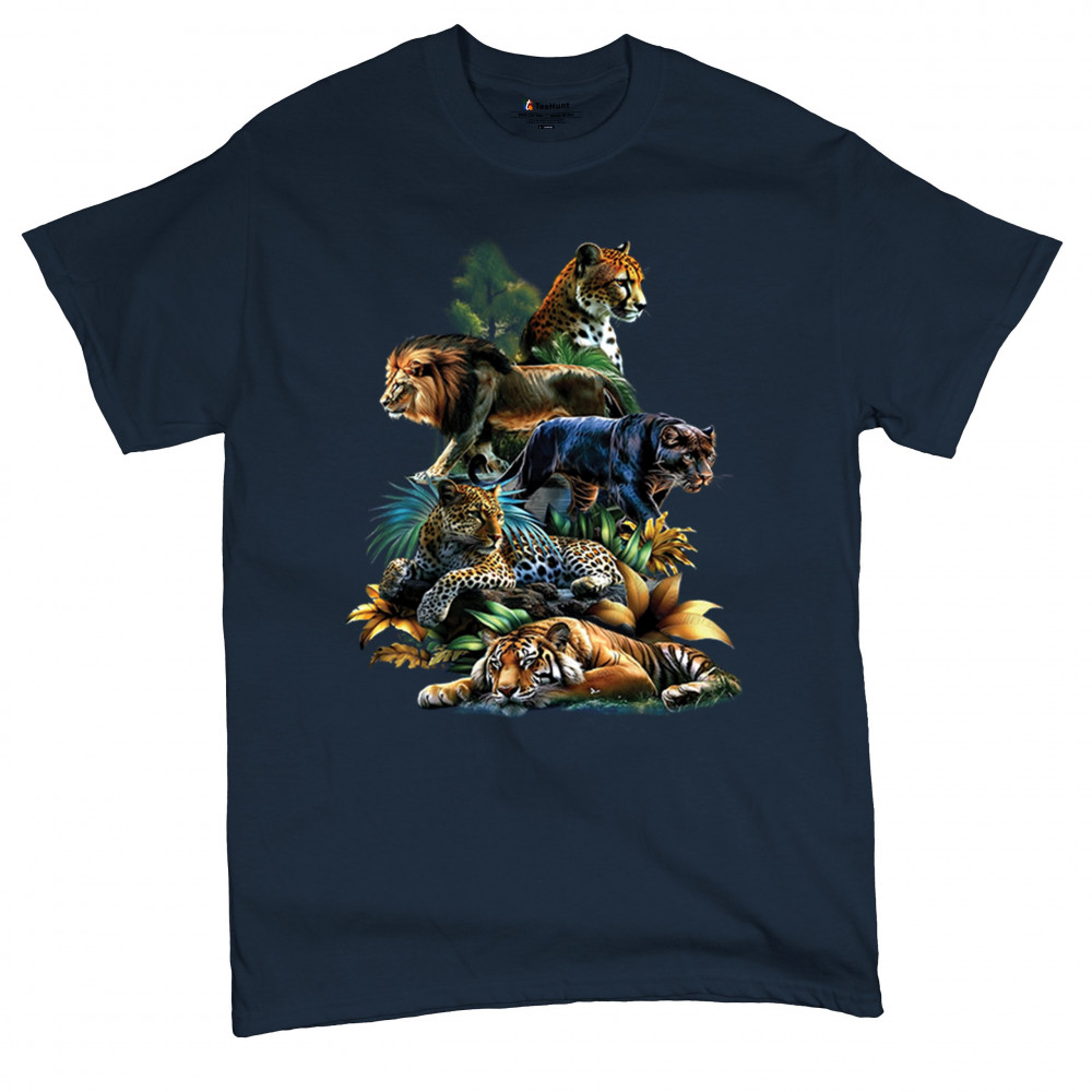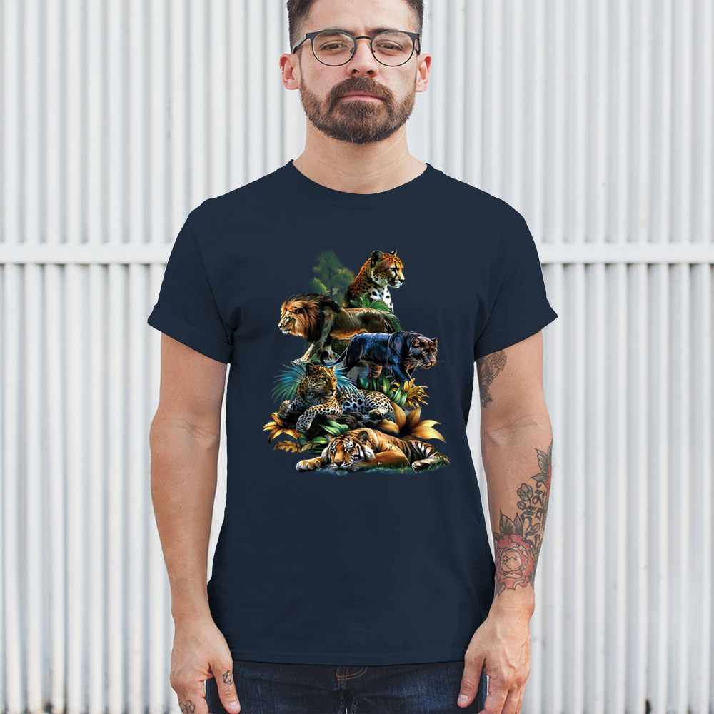 Bold big cat design with lion, tiger, leopard, cheetah, jaguar, and panther. A vivid tribute to wild nature, pride, and animal power.