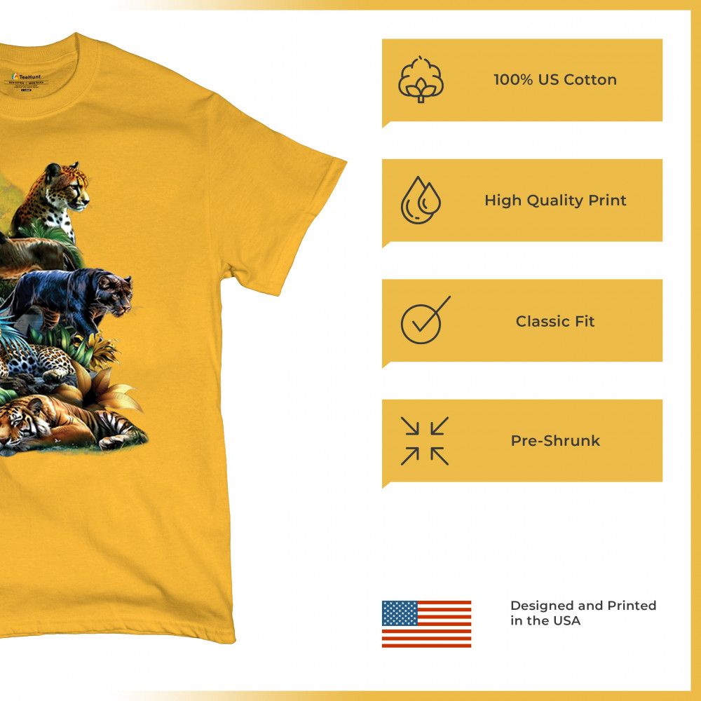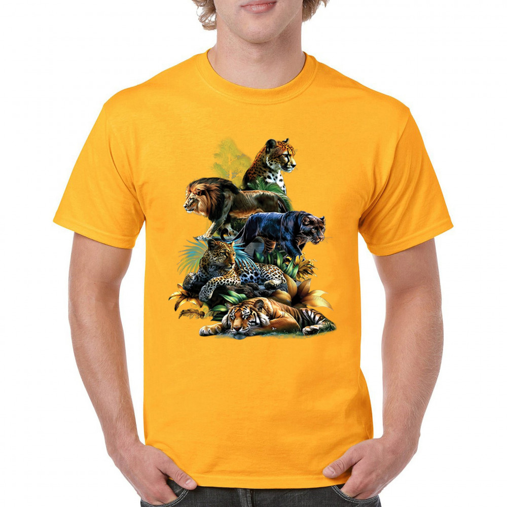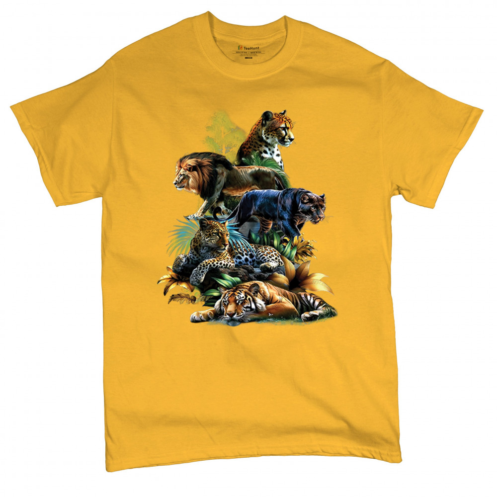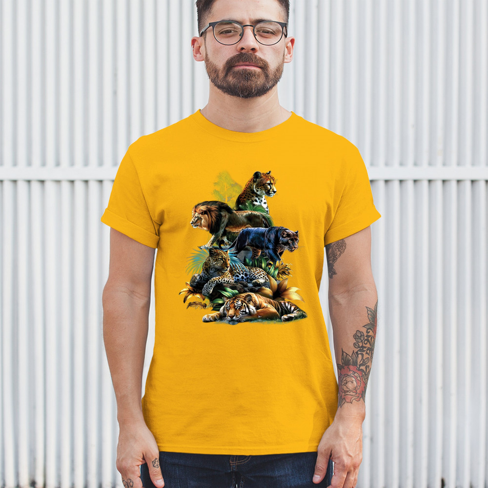 Bold big cat design with lion, tiger, leopard, cheetah, jaguar, and panther. A vivid tribute to wild nature, pride, and animal power.