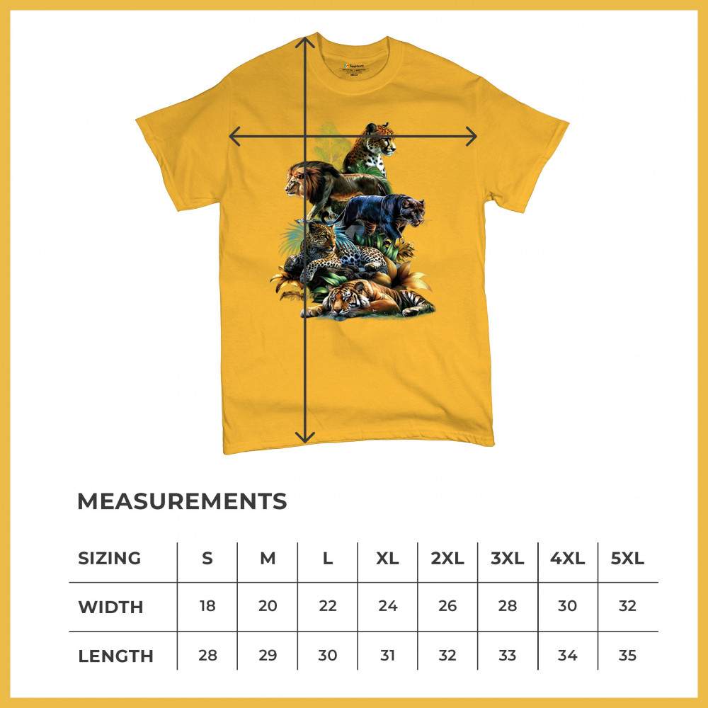 Celebrate raw power and untamed beauty with this stunning big cat design featuring lion, tiger, cheetah, black panther, jaguar, and leopard. Surrounded by vivid jungle foliage, each animal radiates strength, pride, and wild spirit. Perfect for fans of nature, safari vibes, wildlife preservation, and fierce animal energy.