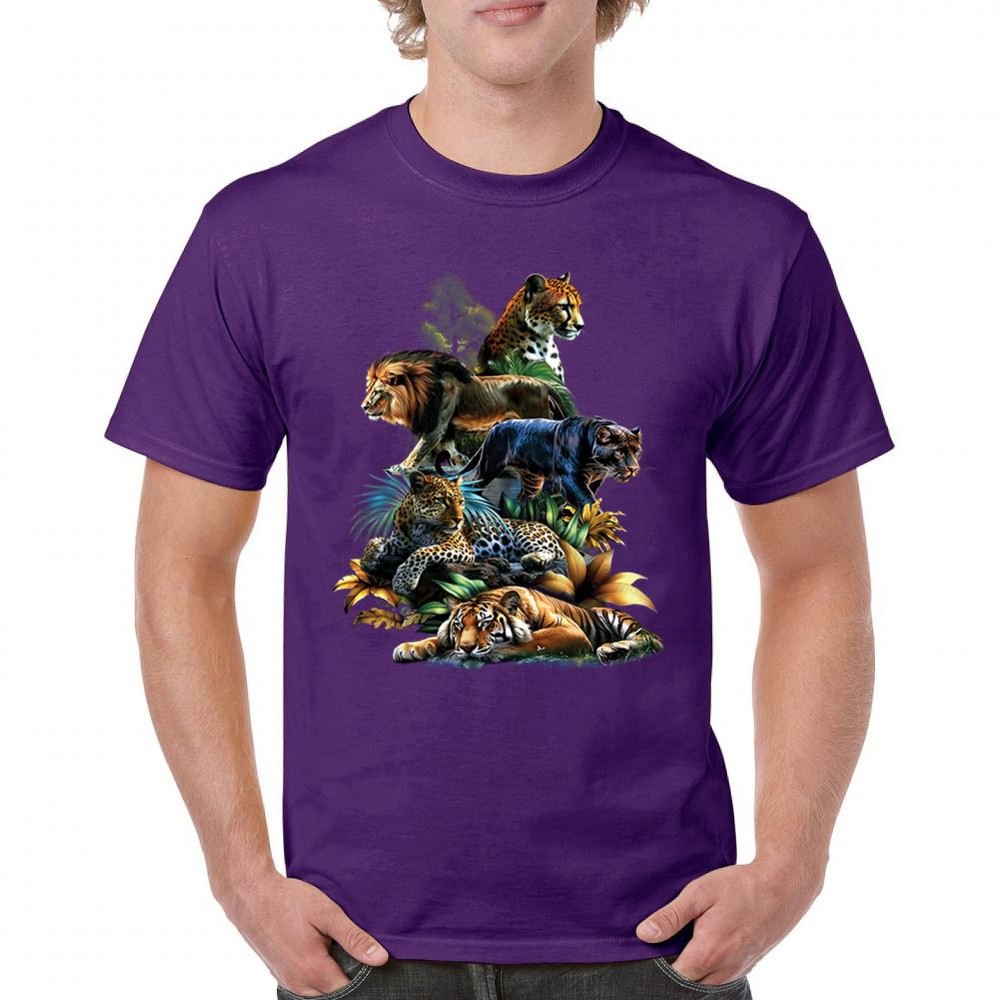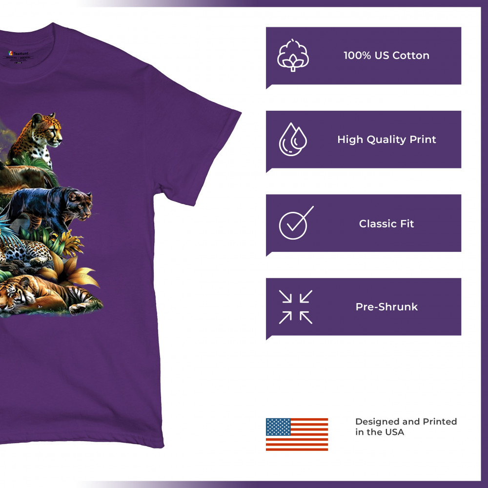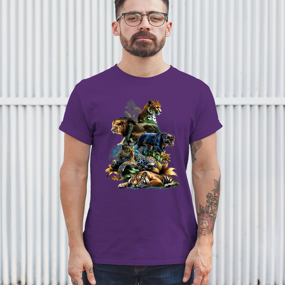 Bold big cat design with lion, tiger, leopard, cheetah, jaguar, and panther. A vivid tribute to wild nature, pride, and animal power.