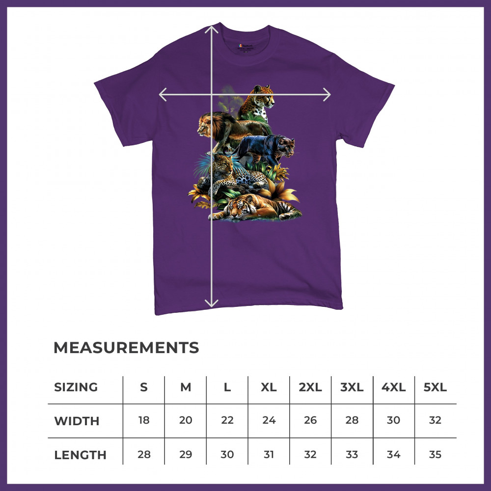 Celebrate raw power and untamed beauty with this stunning big cat design featuring lion, tiger, cheetah, black panther, jaguar, and leopard. Surrounded by vivid jungle foliage, each animal radiates strength, pride, and wild spirit. Perfect for fans of nature, safari vibes, wildlife preservation, and fierce animal energy.