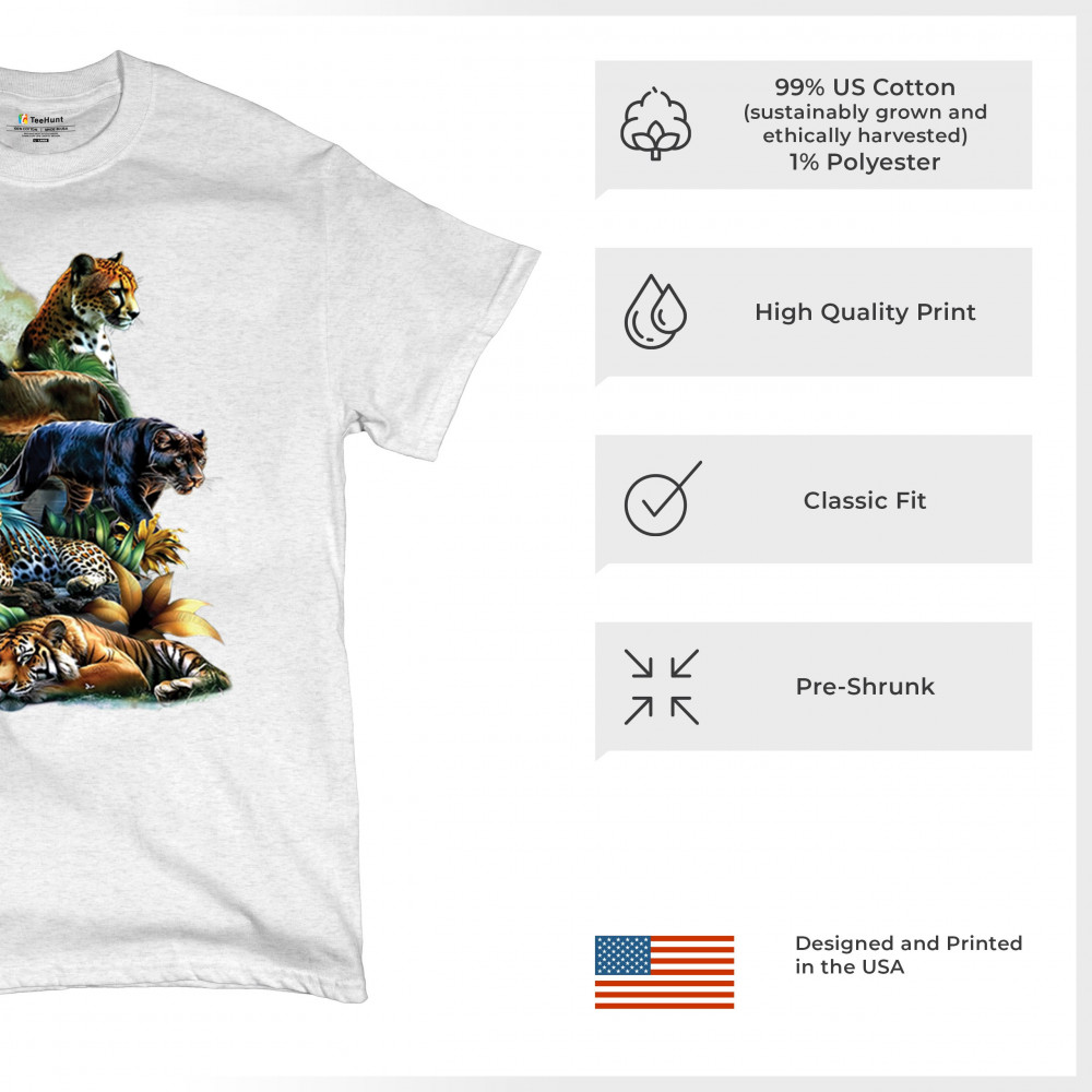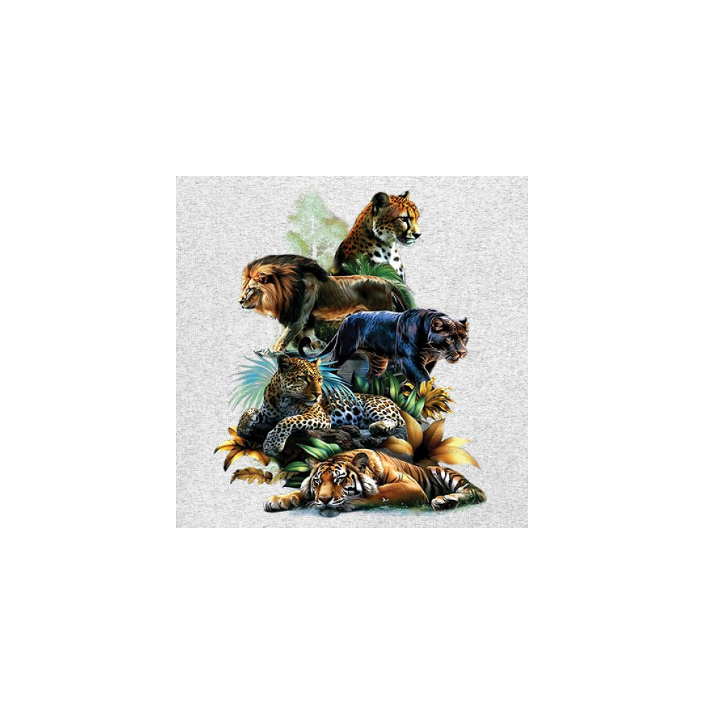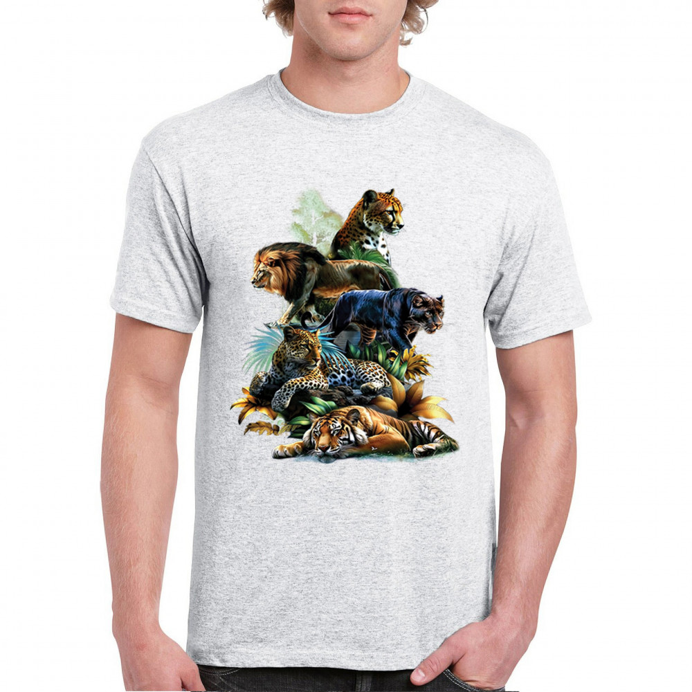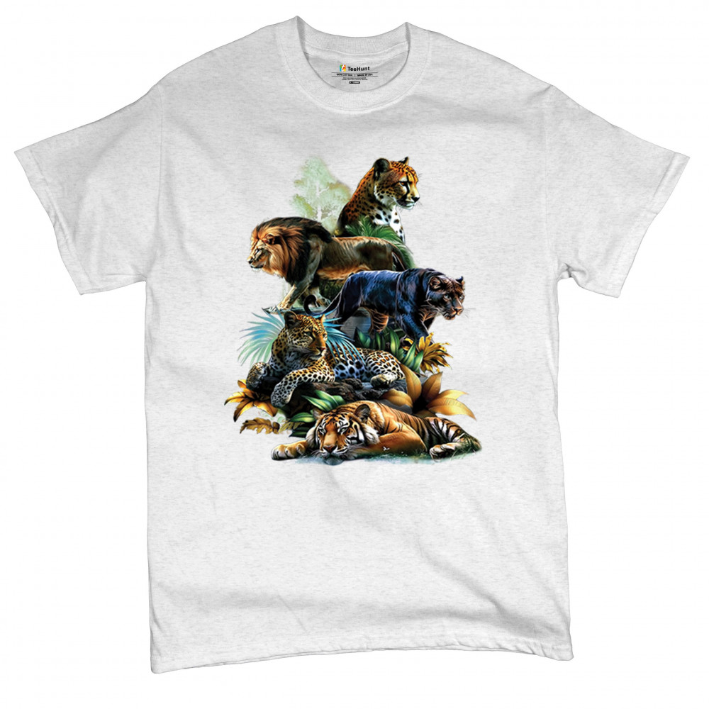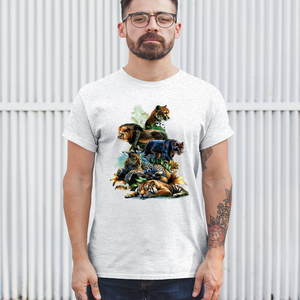 Bold big cat design with lion, tiger, leopard, cheetah, jaguar, and panther. A vivid tribute to wild nature, pride, and animal power.