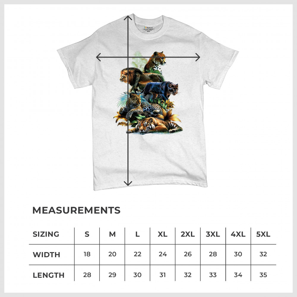Celebrate raw power and untamed beauty with this stunning big cat design featuring lion, tiger, cheetah, black panther, jaguar, and leopard. Surrounded by vivid jungle foliage, each animal radiates strength, pride, and wild spirit. Perfect for fans of nature, safari vibes, wildlife preservation, and fierce animal energy.