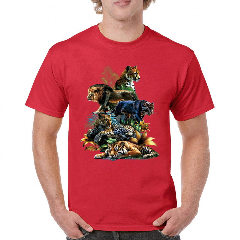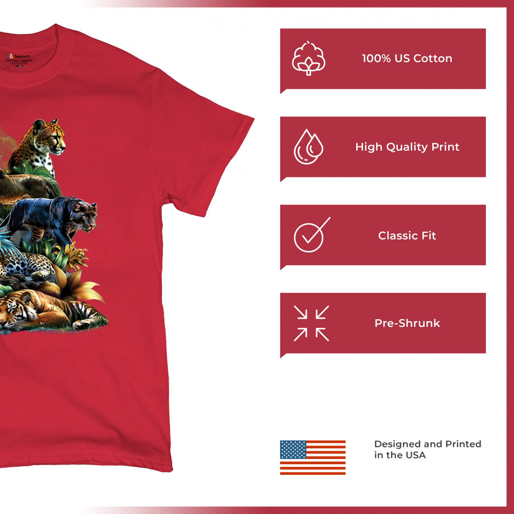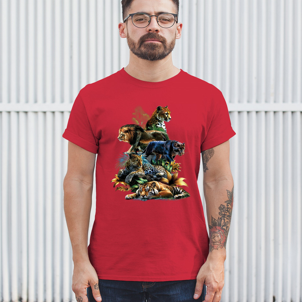 Bold big cat design with lion, tiger, leopard, cheetah, jaguar, and panther. A vivid tribute to wild nature, pride, and animal power.