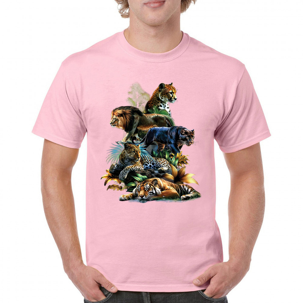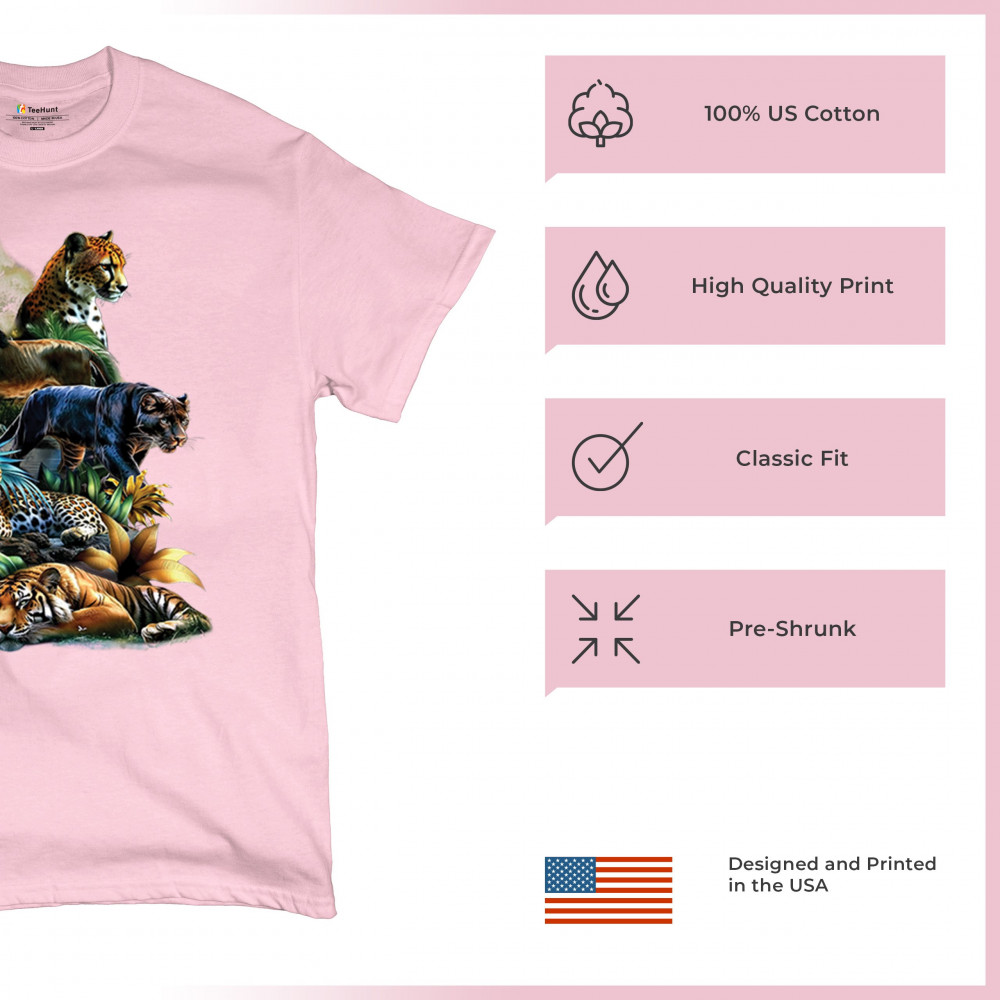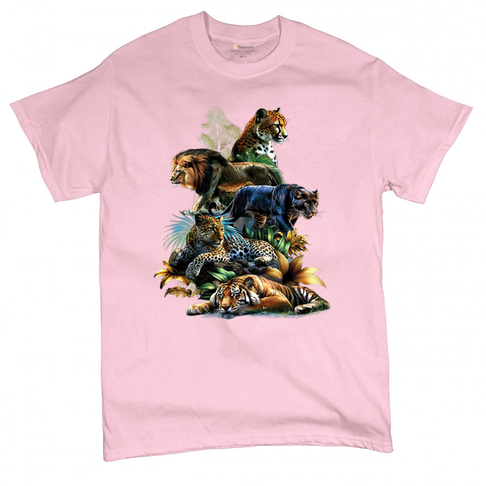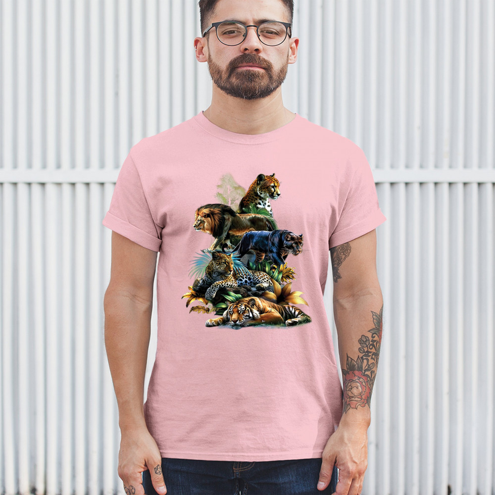 Bold big cat design with lion, tiger, leopard, cheetah, jaguar, and panther. A vivid tribute to wild nature, pride, and animal power.