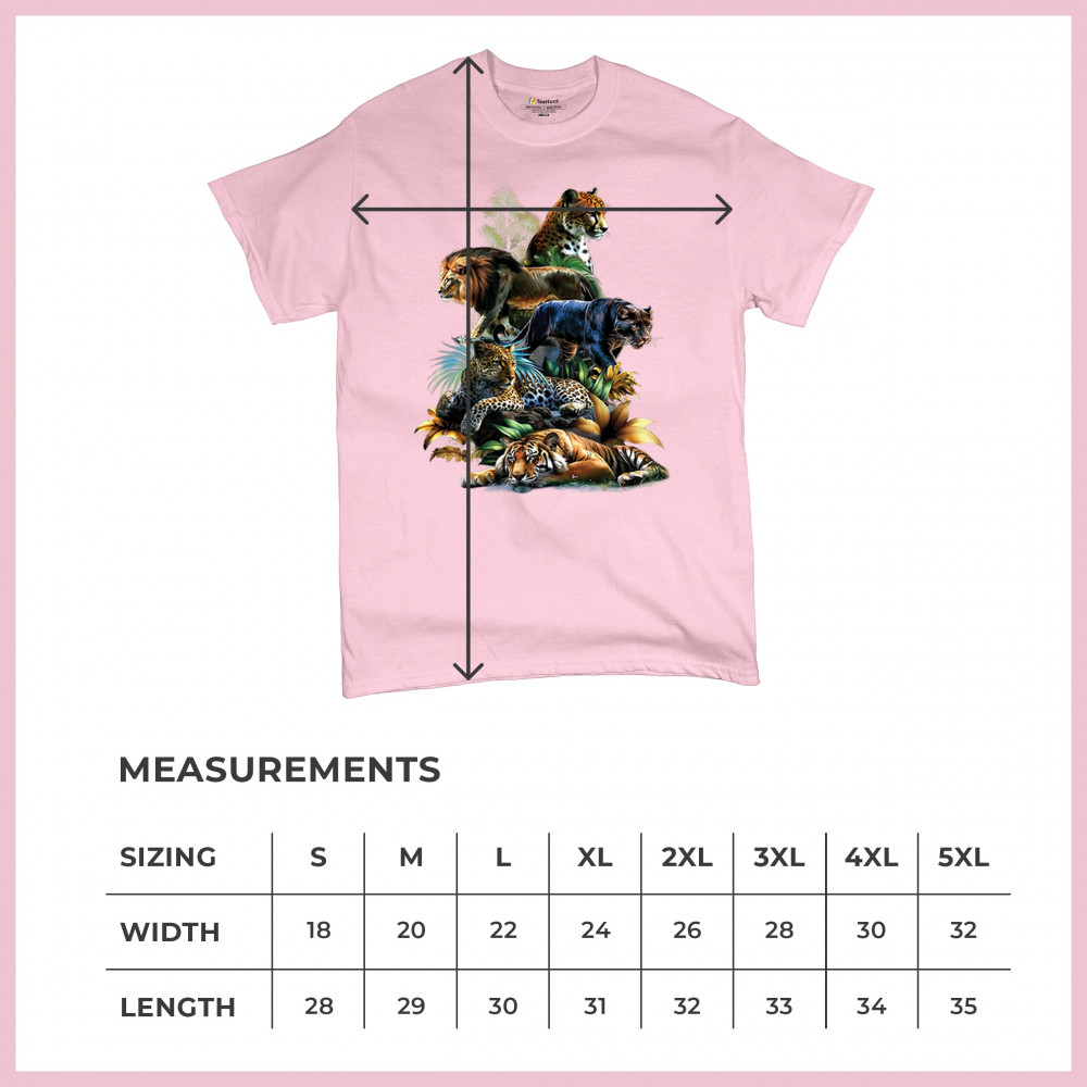 Celebrate raw power and untamed beauty with this stunning big cat design featuring lion, tiger, cheetah, black panther, jaguar, and leopard. Surrounded by vivid jungle foliage, each animal radiates strength, pride, and wild spirit. Perfect for fans of nature, safari vibes, wildlife preservation, and fierce animal energy.