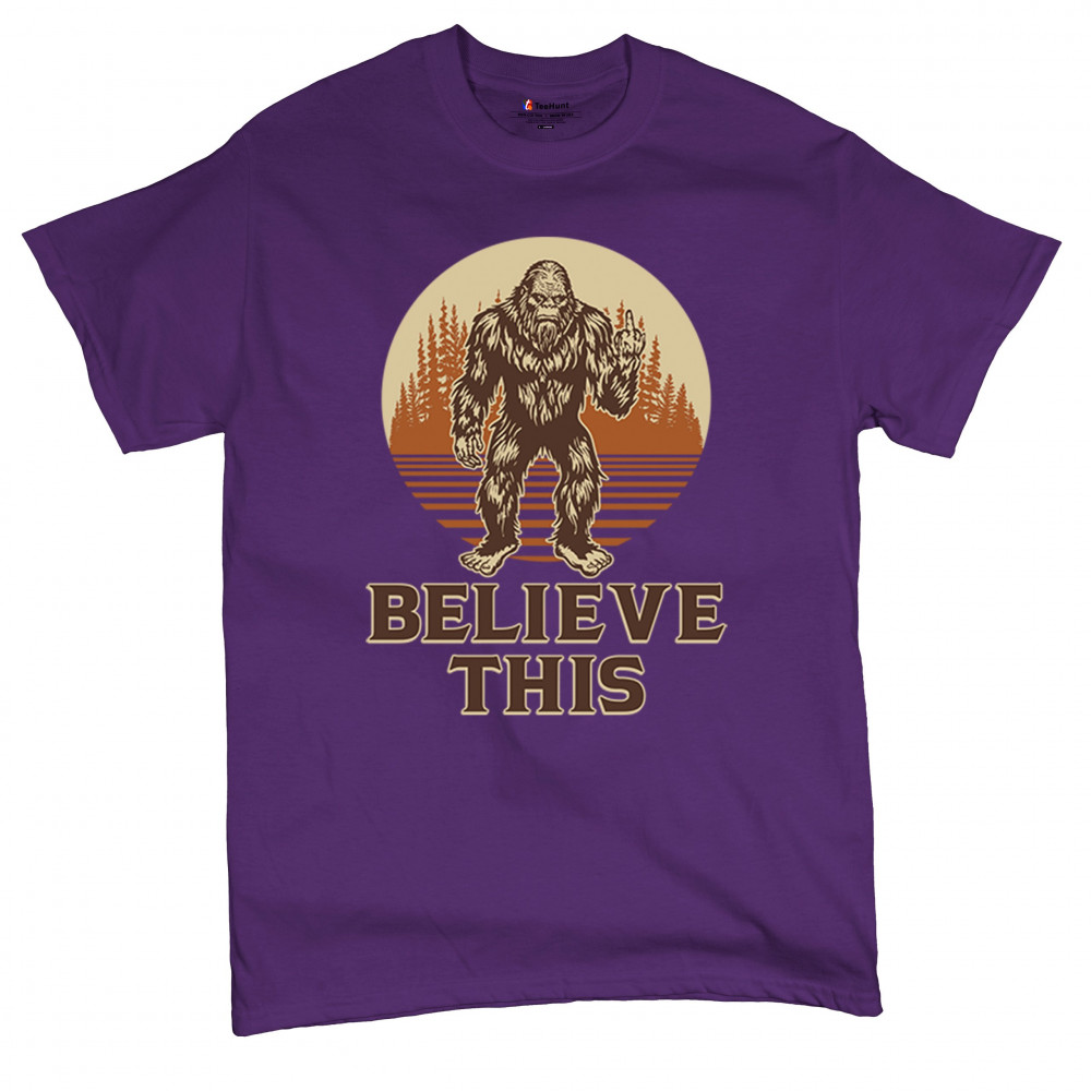 The Believe This Bigfoot design blends cryptid folklore with blunt attitude—because sometimes you just don’t care who believes. Featuring Bigfoot flipping the bird against a rustic tree line, it’s perfect for campers, rebels, and fans of sarcastic forest humor. Ideal for hikes, festivals, and off-grid living.