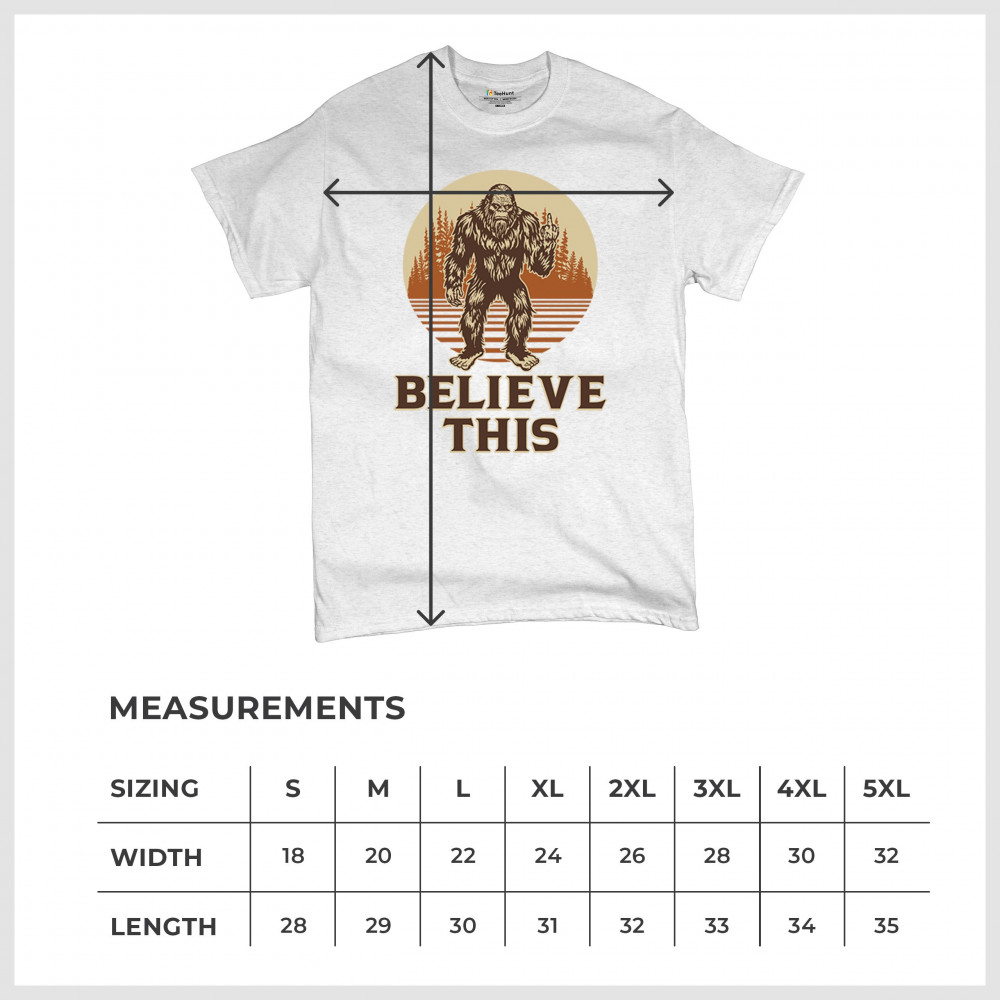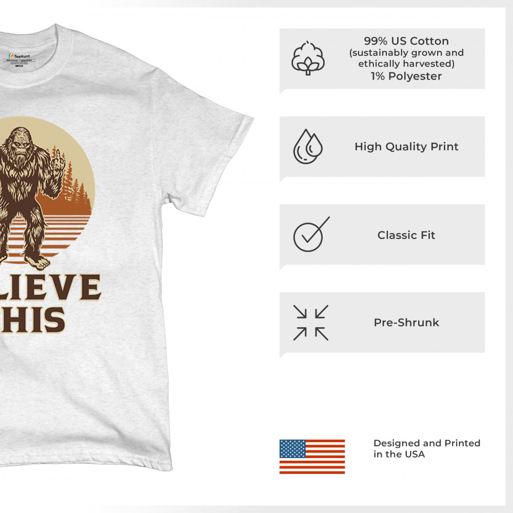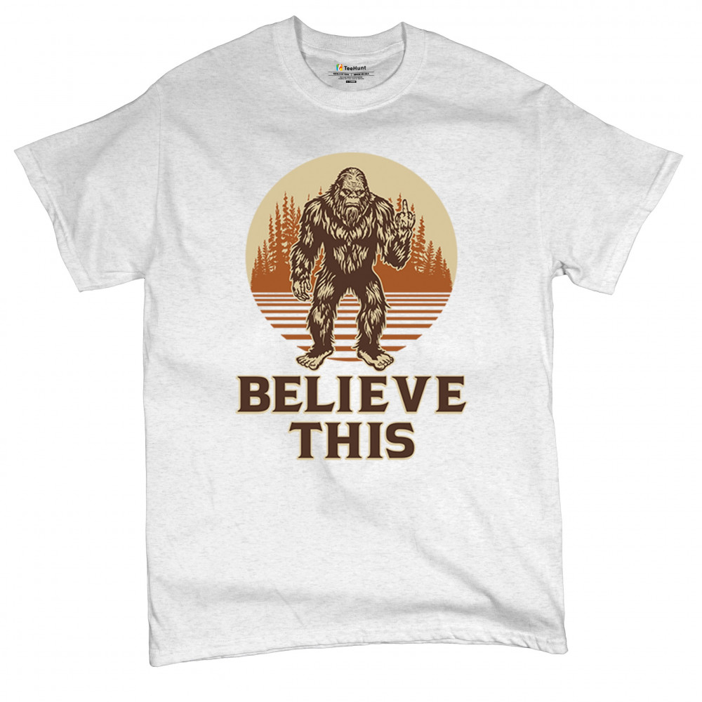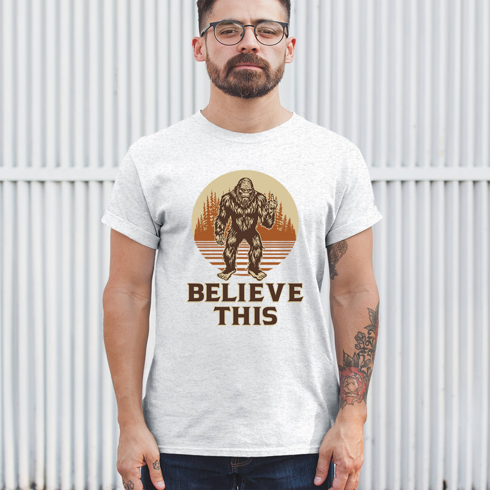 The Believe This Bigfoot design blends cryptid folklore with blunt attitude—because sometimes you just don’t care who believes. Featuring Bigfoot flipping the bird against a rustic tree line, it’s perfect for campers, rebels, and fans of sarcastic forest humor. Ideal for hikes, festivals, and off-grid living.