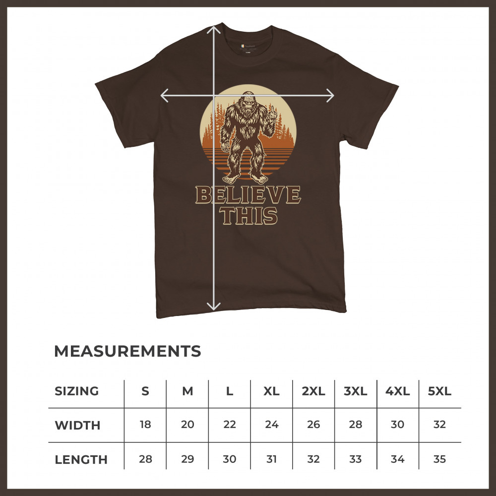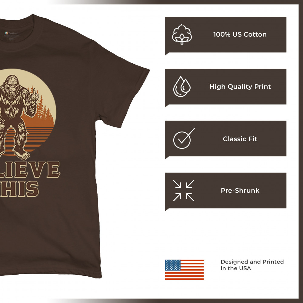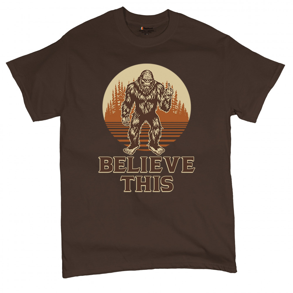 The Believe This Bigfoot design blends cryptid folklore with blunt attitude—because sometimes you just don’t care who believes. Featuring Bigfoot flipping the bird against a rustic tree line, it’s perfect for campers, rebels, and fans of sarcastic forest humor. Ideal for hikes, festivals, and off-grid living.
