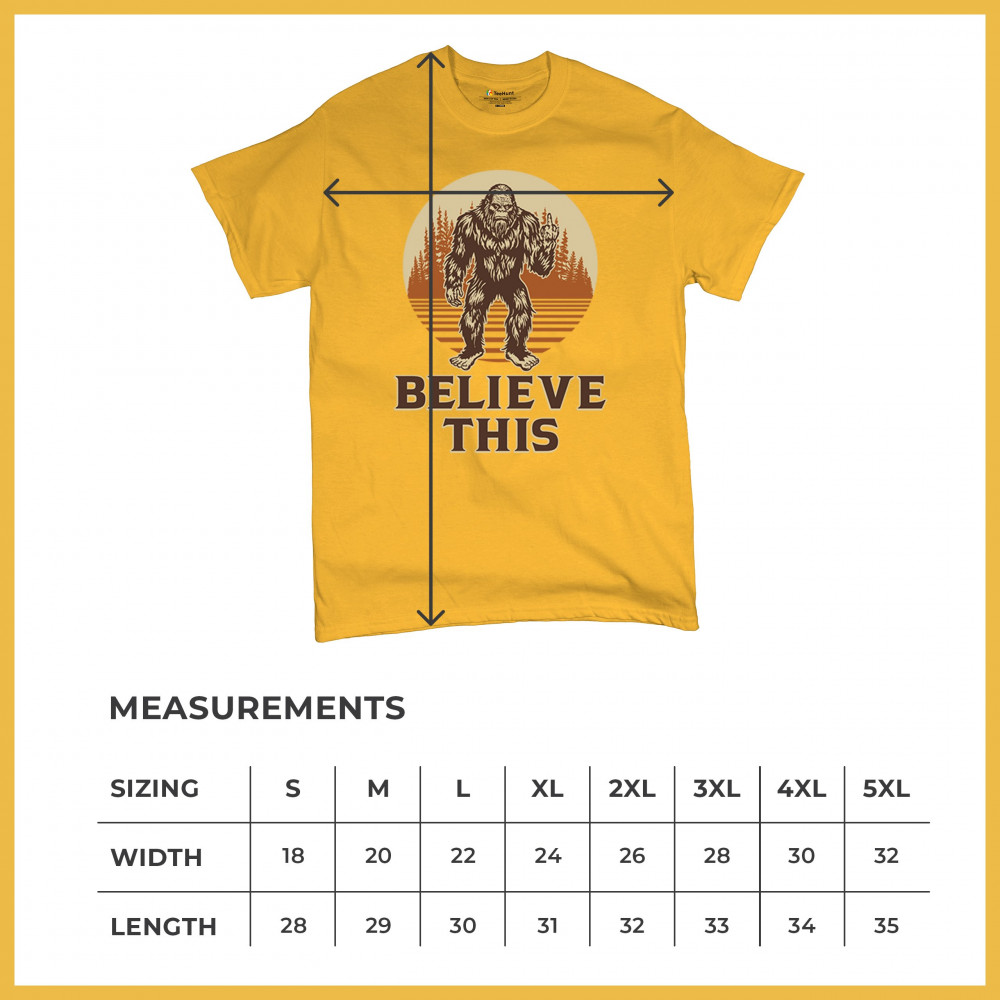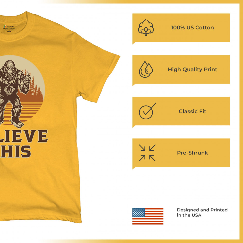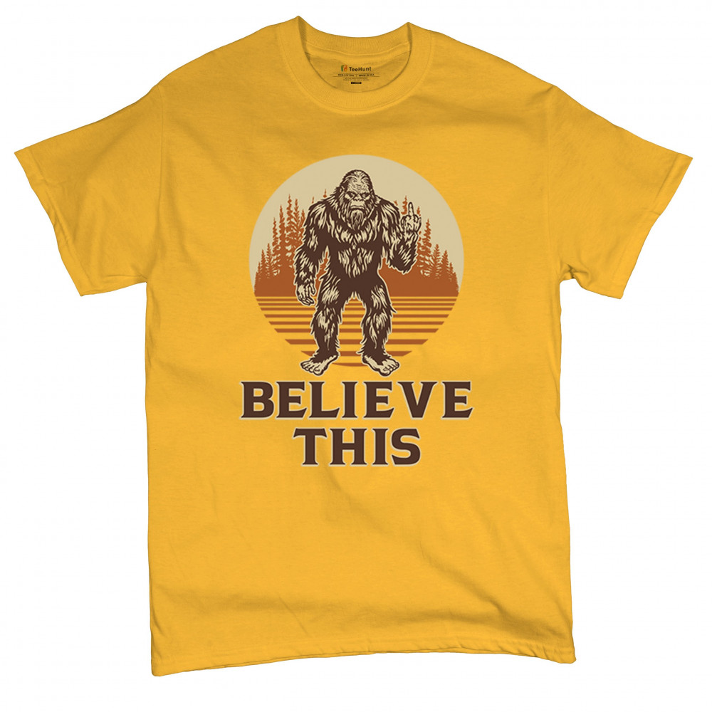 The Believe This Bigfoot design blends cryptid folklore with blunt attitude—because sometimes you just don’t care who believes. Featuring Bigfoot flipping the bird against a rustic tree line, it’s perfect for campers, rebels, and fans of sarcastic forest humor. Ideal for hikes, festivals, and off-grid living.