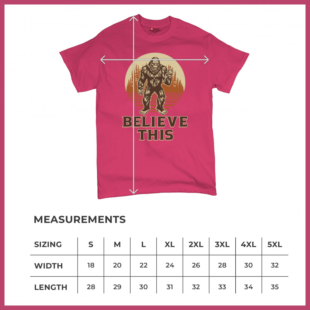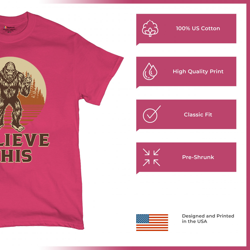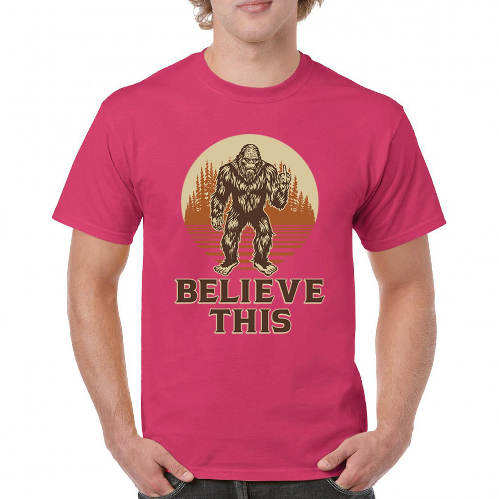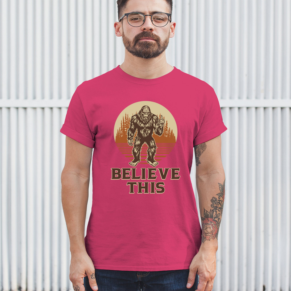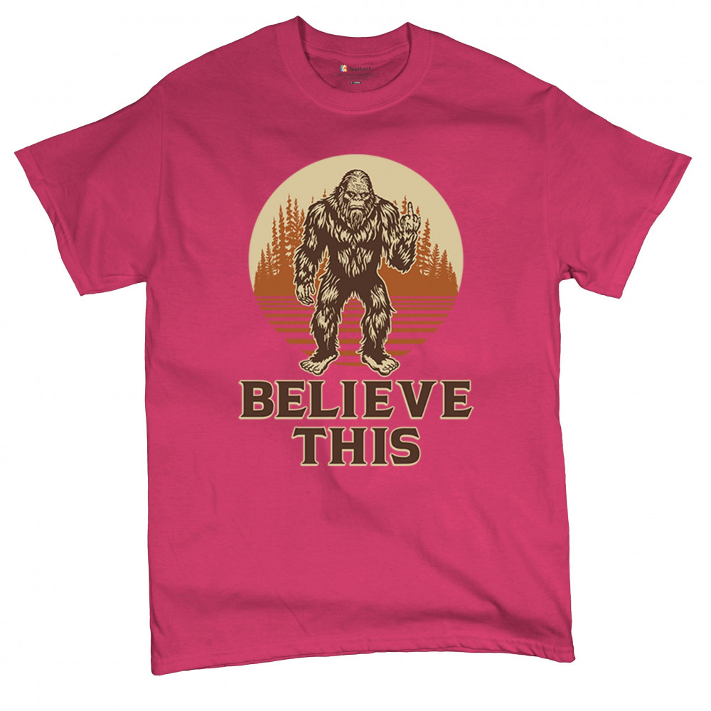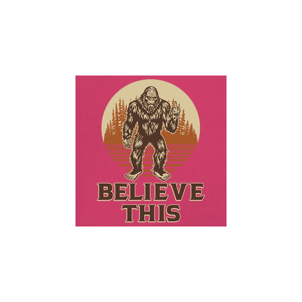 The Believe This Bigfoot design blends cryptid folklore with blunt attitude—because sometimes you just don’t care who believes. Featuring Bigfoot flipping the bird against a rustic tree line, it’s perfect for campers, rebels, and fans of sarcastic forest humor. Ideal for hikes, festivals, and off-grid living.