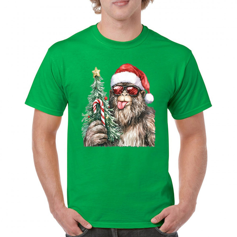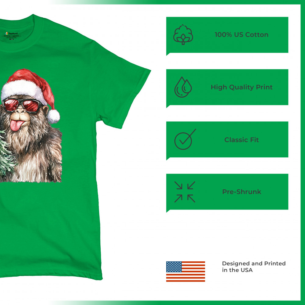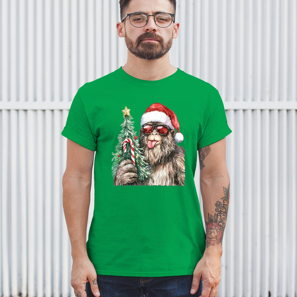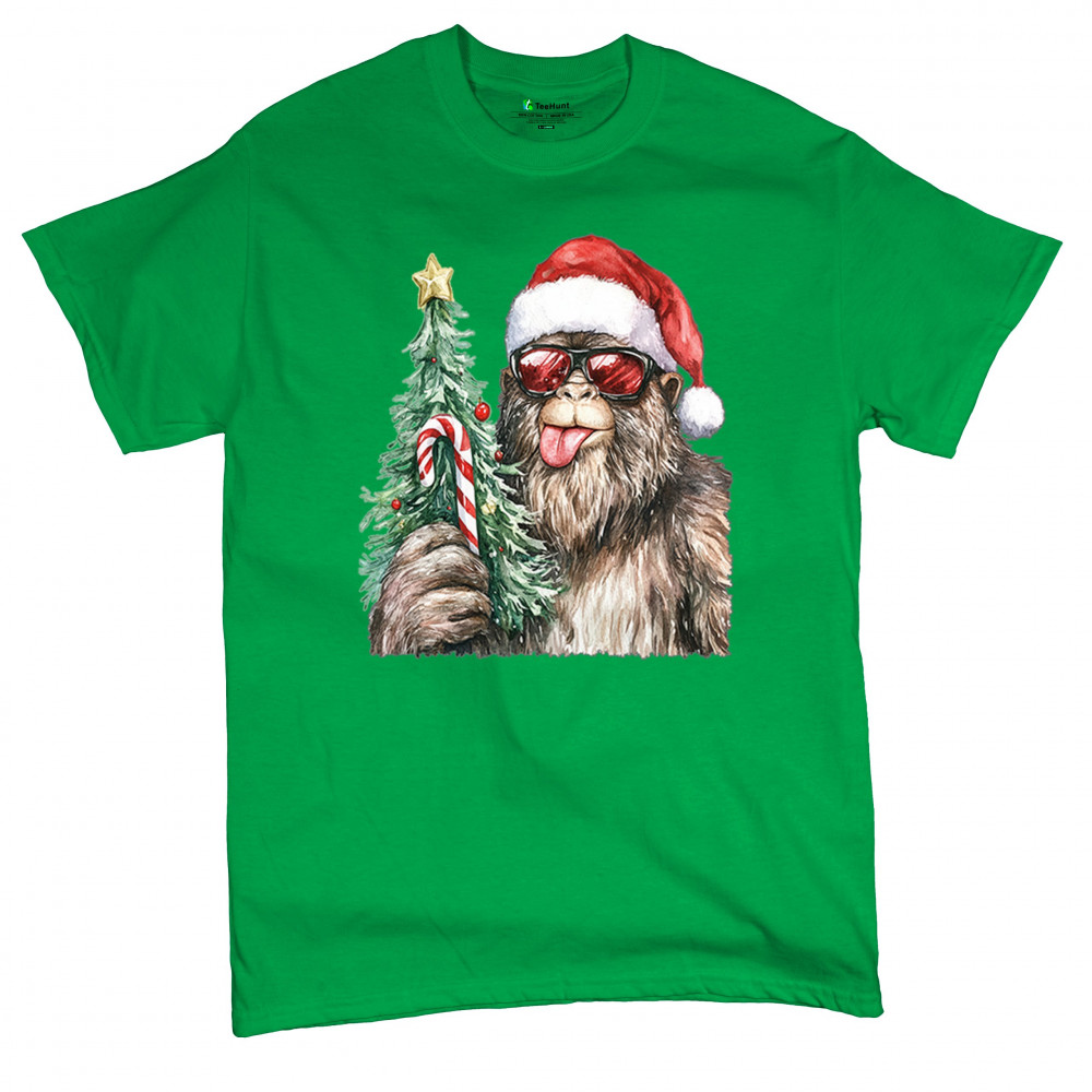 Bigfoot Christmas Santa shirt – festive Sasquatch holiday humor tee with Santa hat design, Xmas tree, candy cane, and funny Christmas style.