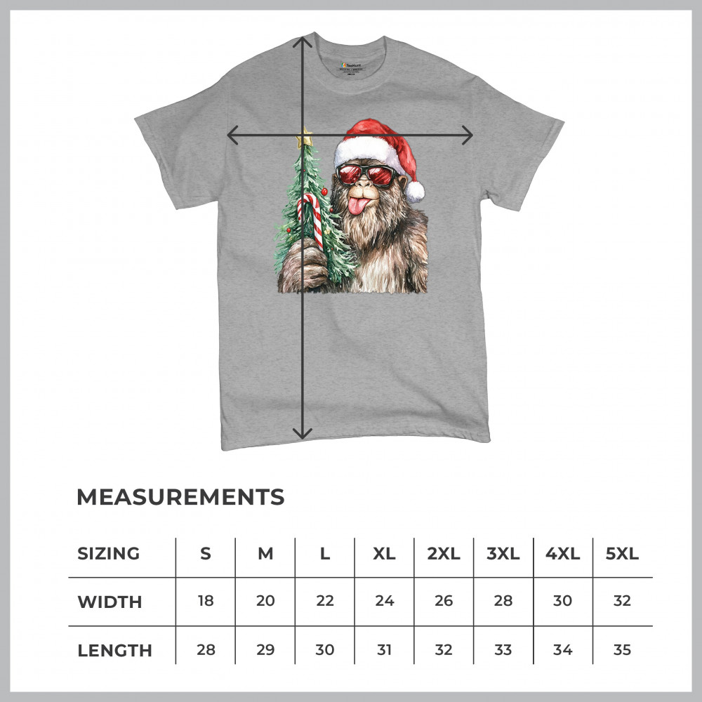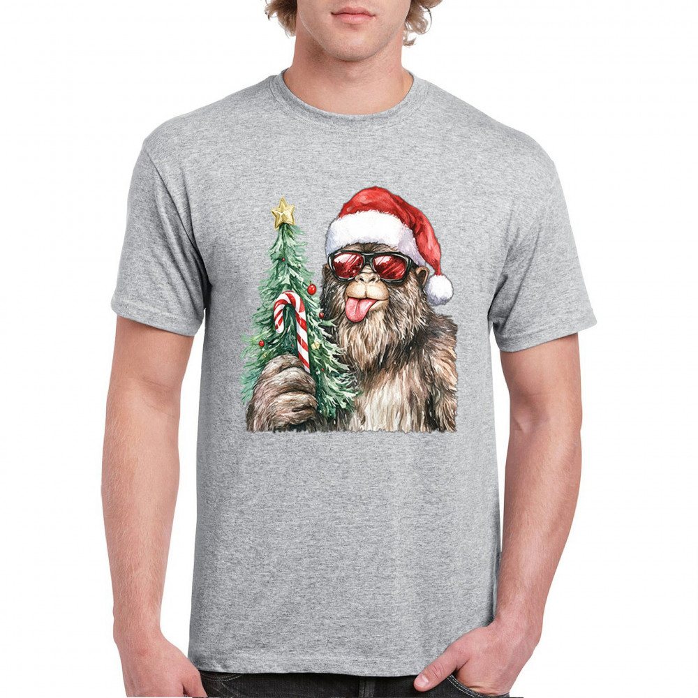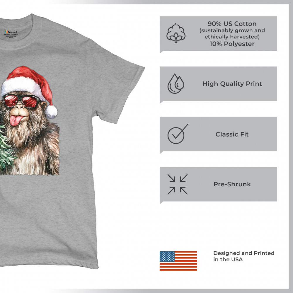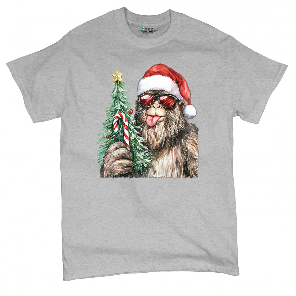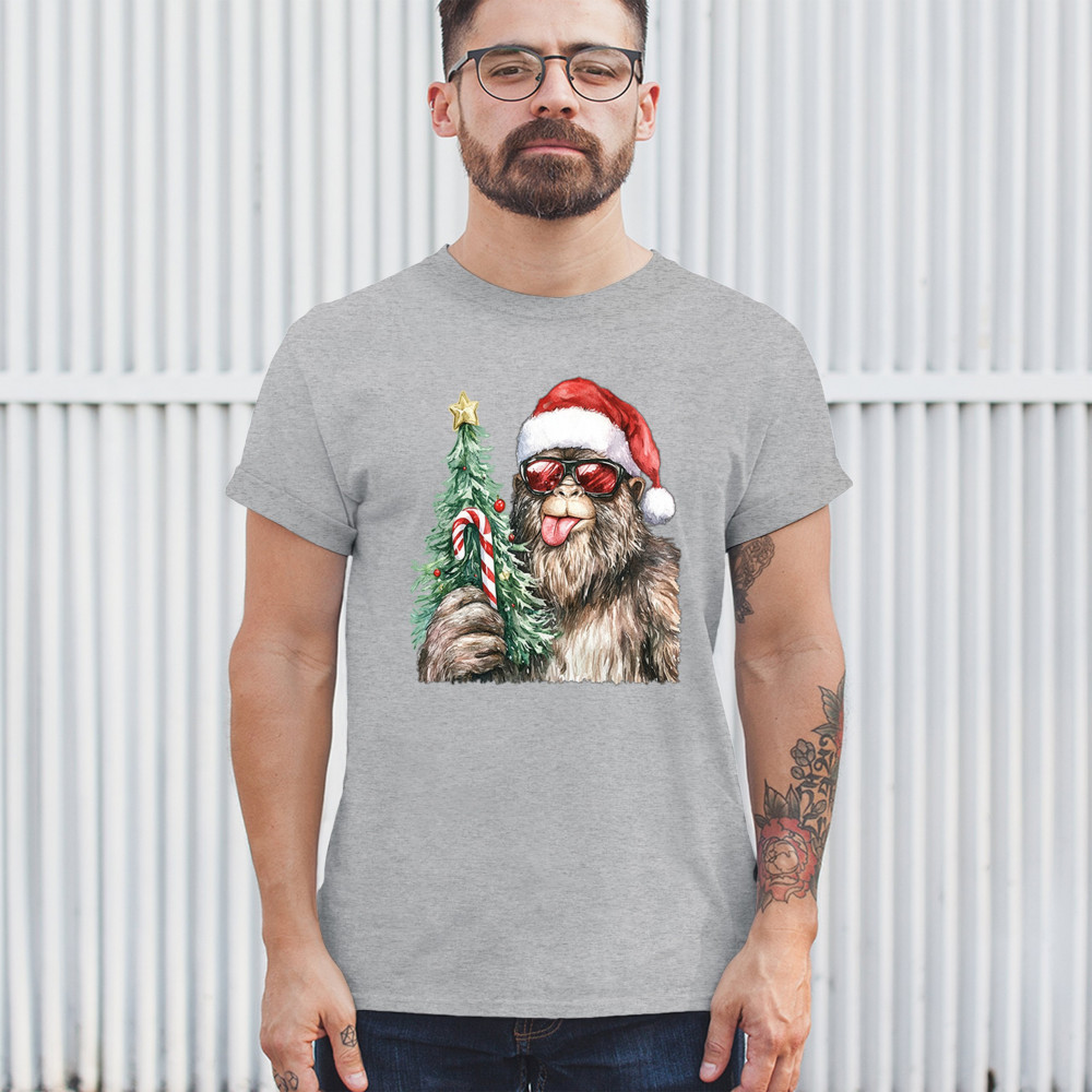 Bigfoot Christmas Santa shirt – festive Sasquatch holiday humor tee with Santa hat design, Xmas tree, candy cane, and funny Christmas style.