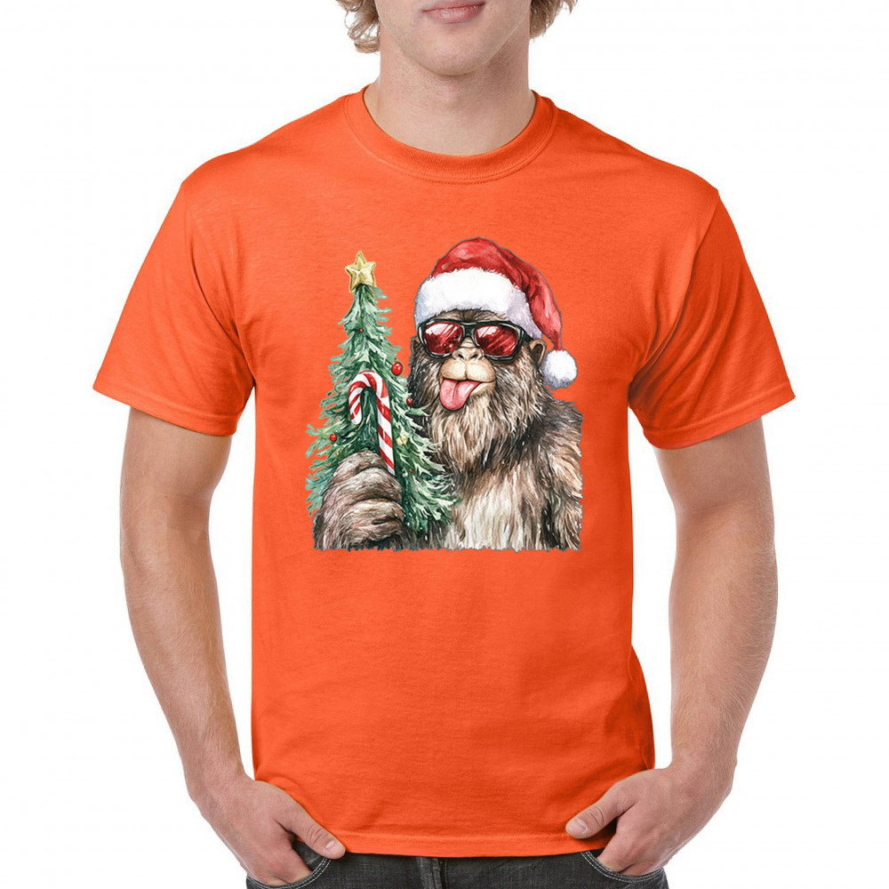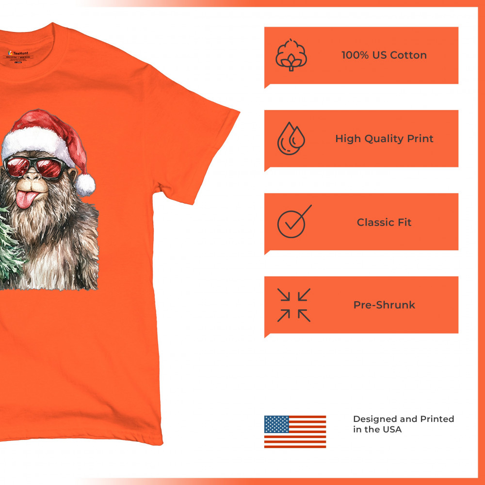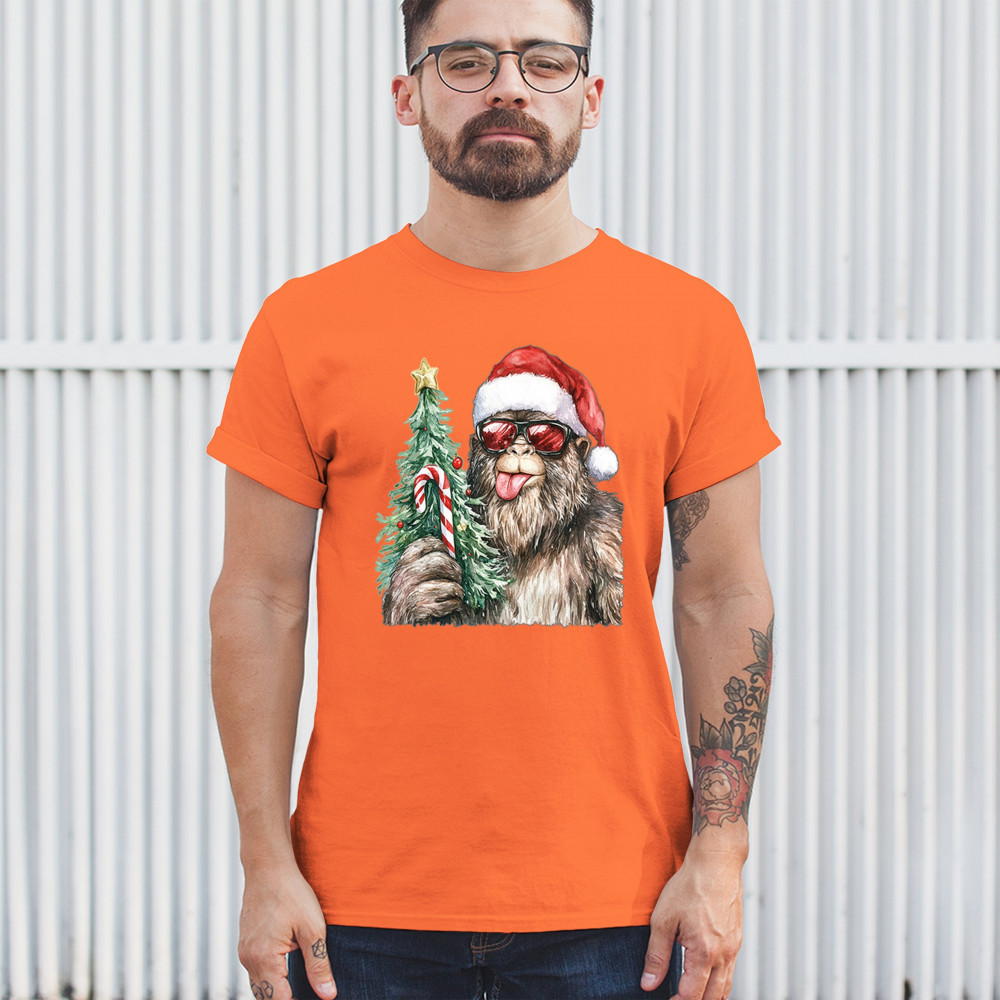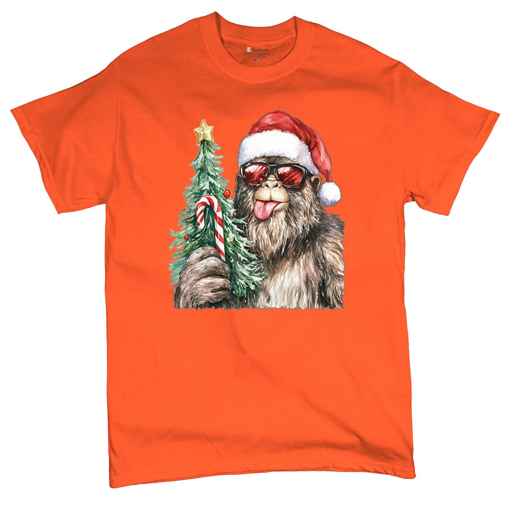 Bigfoot Christmas Santa shirt – festive Sasquatch holiday humor tee with Santa hat design, Xmas tree, candy cane, and funny Christmas style.