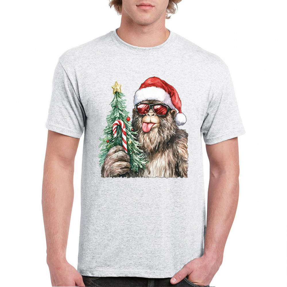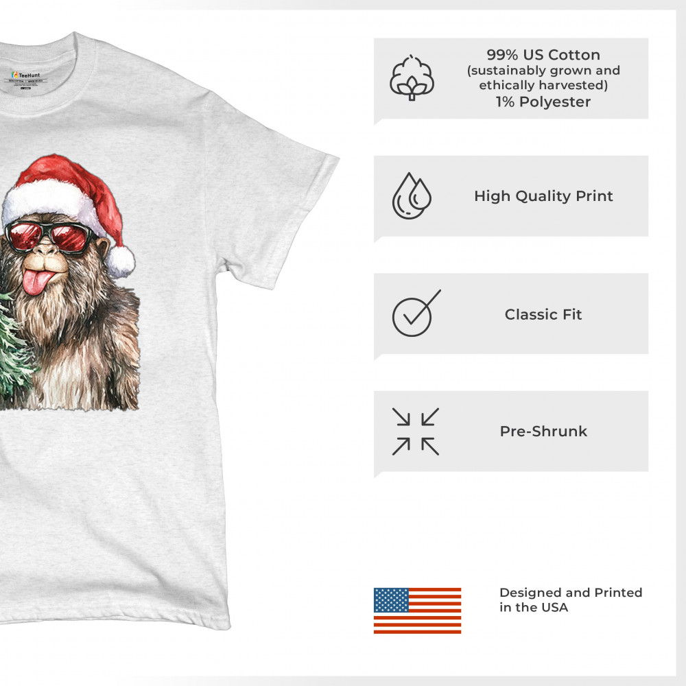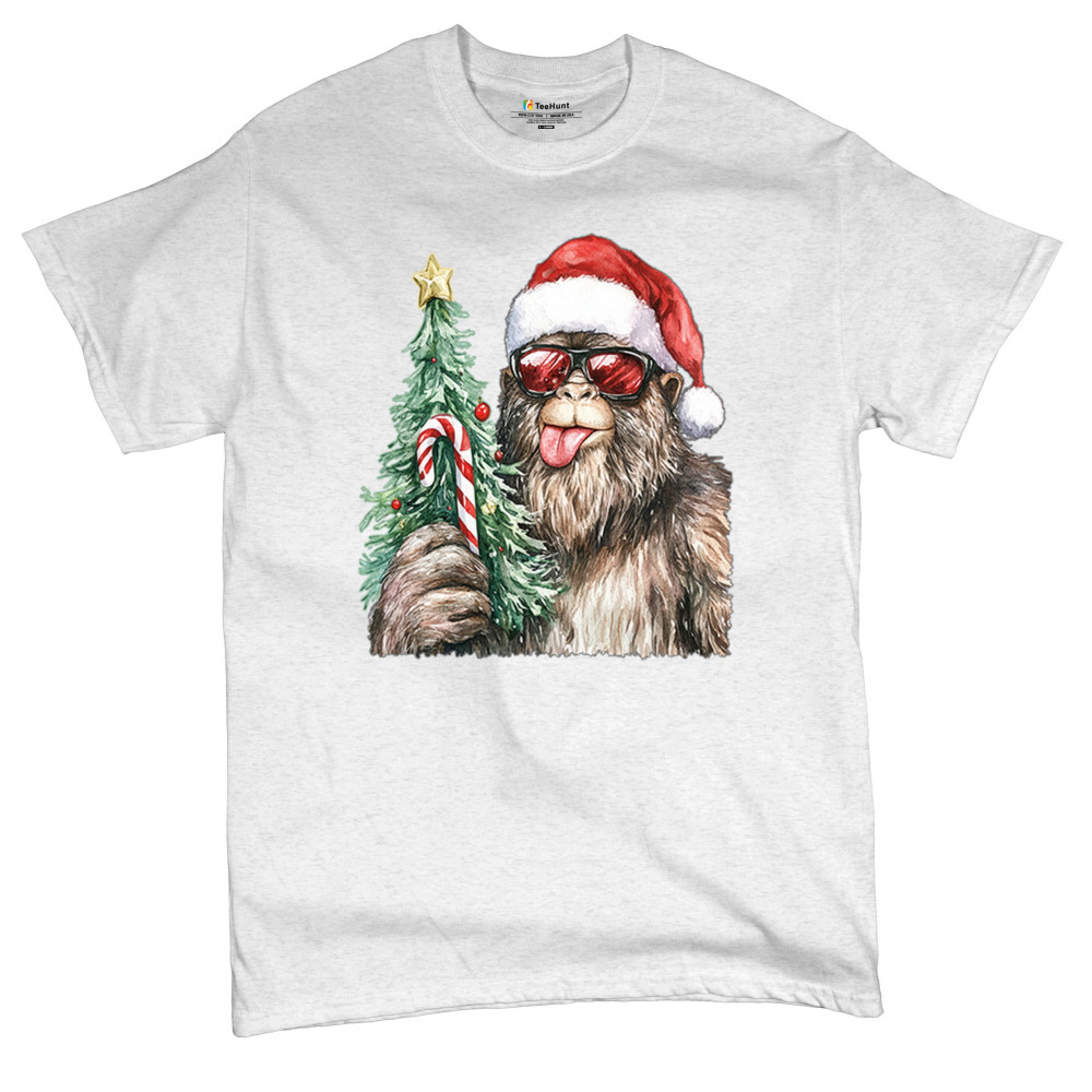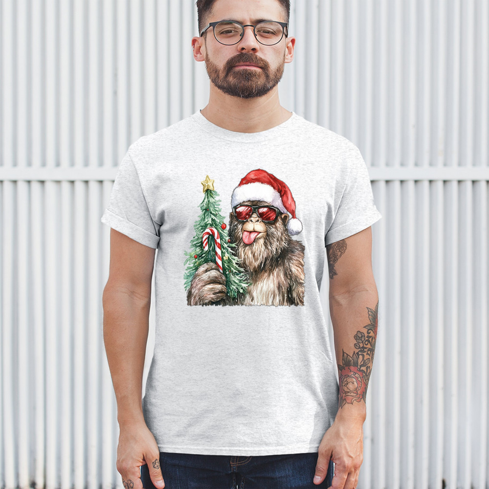 Bigfoot Christmas Santa shirt – festive Sasquatch holiday humor tee with Santa hat design, Xmas tree, candy cane, and funny Christmas style.