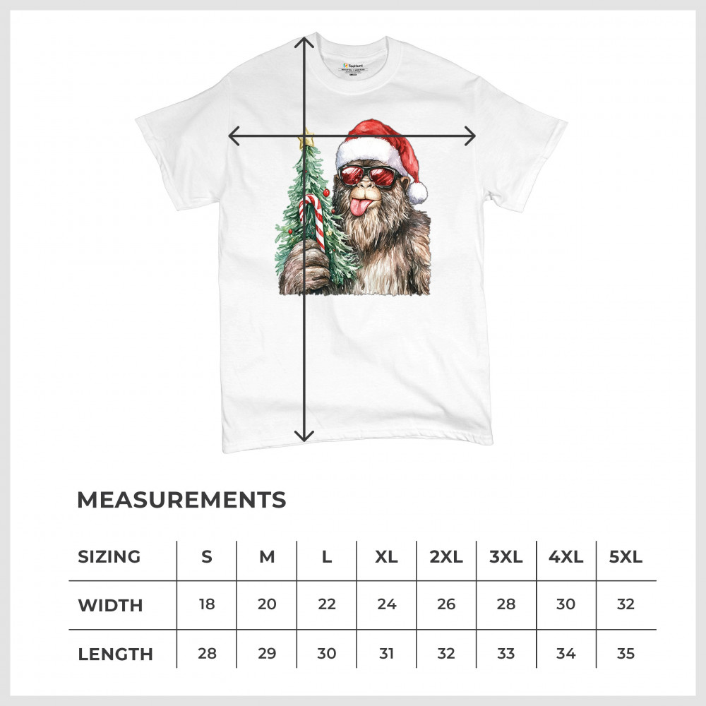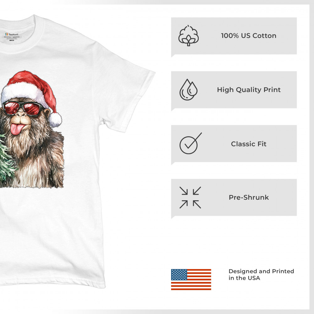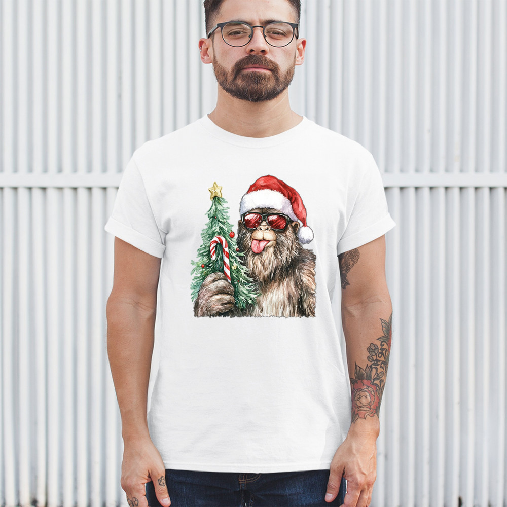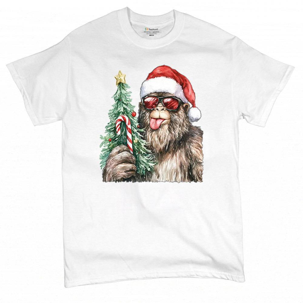 Bigfoot Christmas Santa shirt – festive Sasquatch holiday humor tee with Santa hat design, Xmas tree, candy cane, and funny Christmas style.
