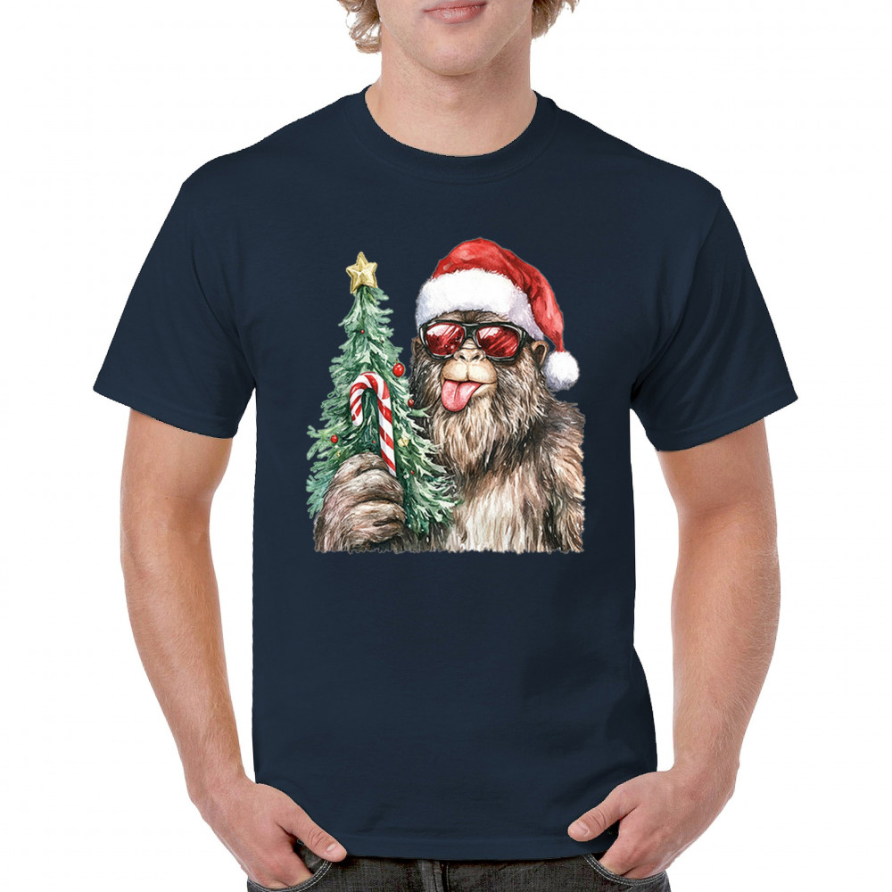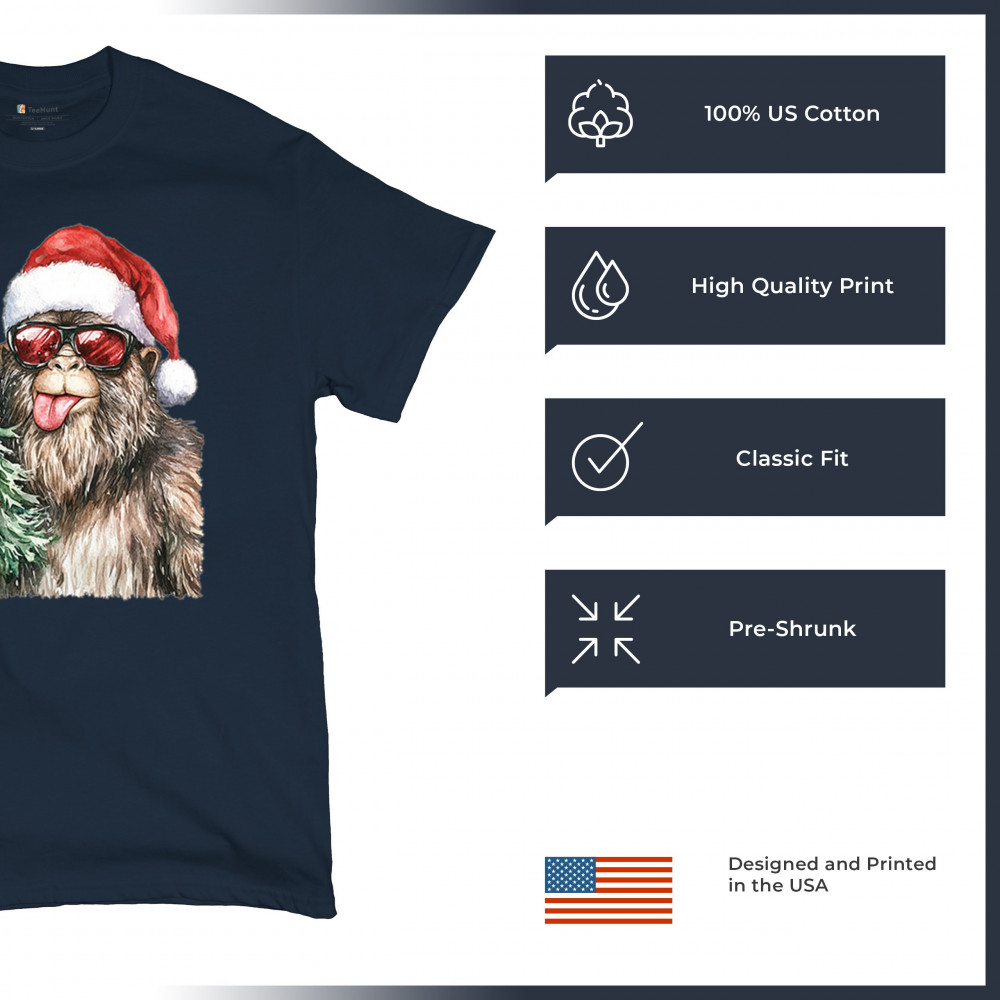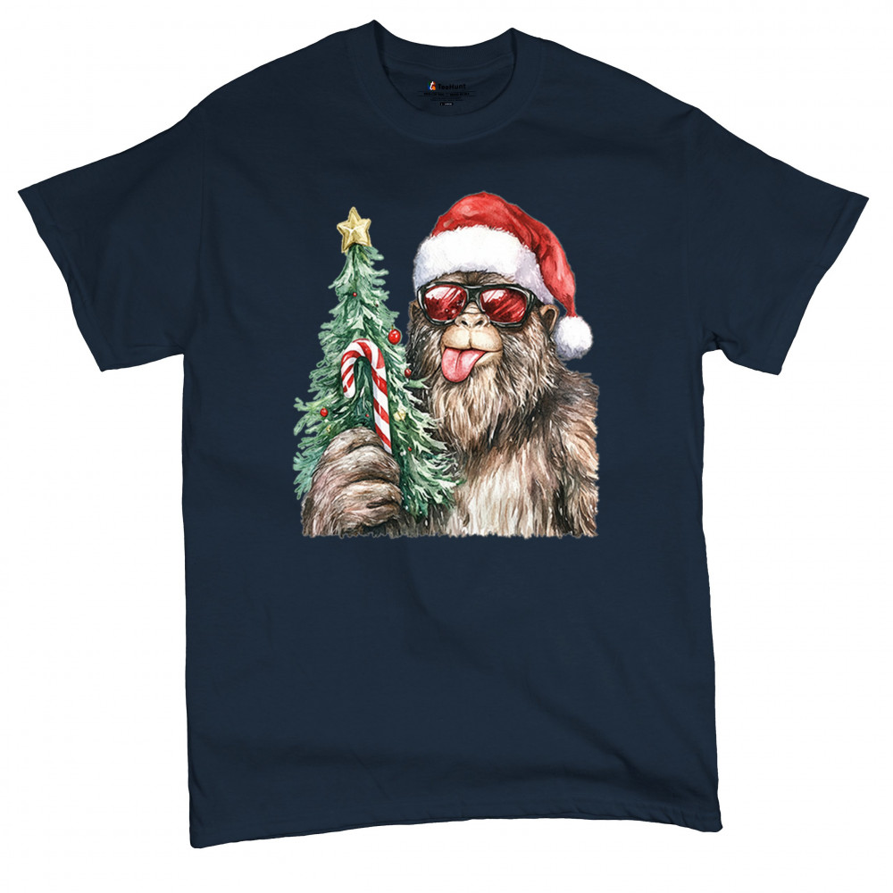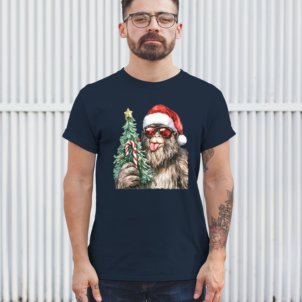 Bigfoot Christmas Santa shirt – festive Sasquatch holiday humor tee with Santa hat design, Xmas tree, candy cane, and funny Christmas style.