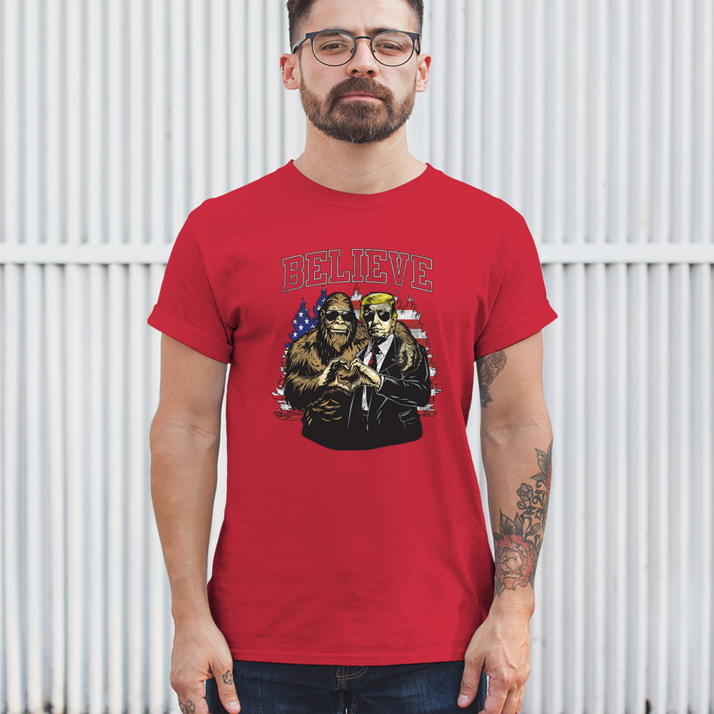 The "Believe" design combines patriotic pride and conservative values with a touch of fun. Featuring Donald J. Trump and a loyal Bigfoot against the American flag, this graphic is perfect for Trump supporters, Republicans, and believers in America First. Celebrate the Red Wave, the 47th President, and the unstoppable fight for victory. Ideal for anyone with unwavering belief in the people's mandate.
