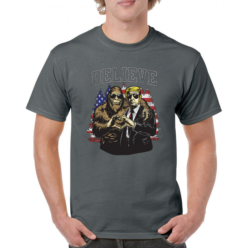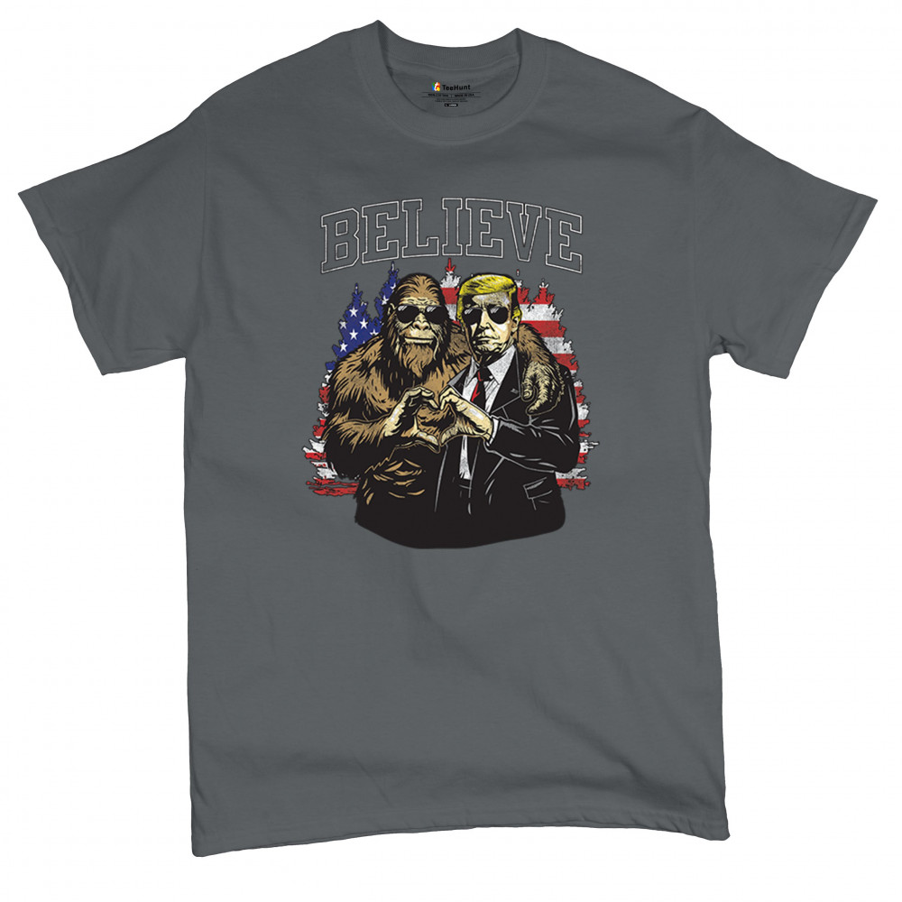 The "Believe" design combines patriotic pride and conservative values with a touch of fun. Featuring Donald J. Trump and a loyal Bigfoot against the American flag, this graphic is perfect for Trump supporters, Republicans, and believers in America First. Celebrate the Red Wave, the 47th President, and the unstoppable fight for victory. Ideal for anyone with unwavering belief in the people's mandate.
