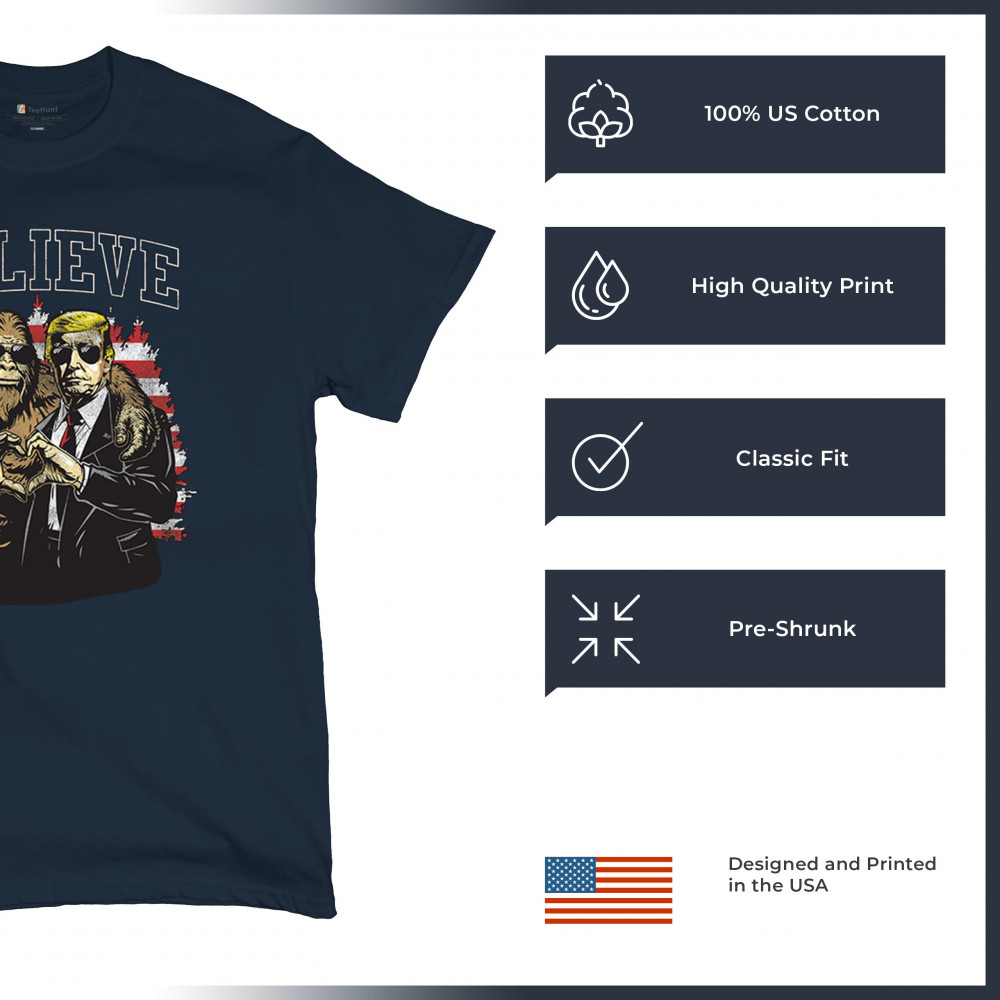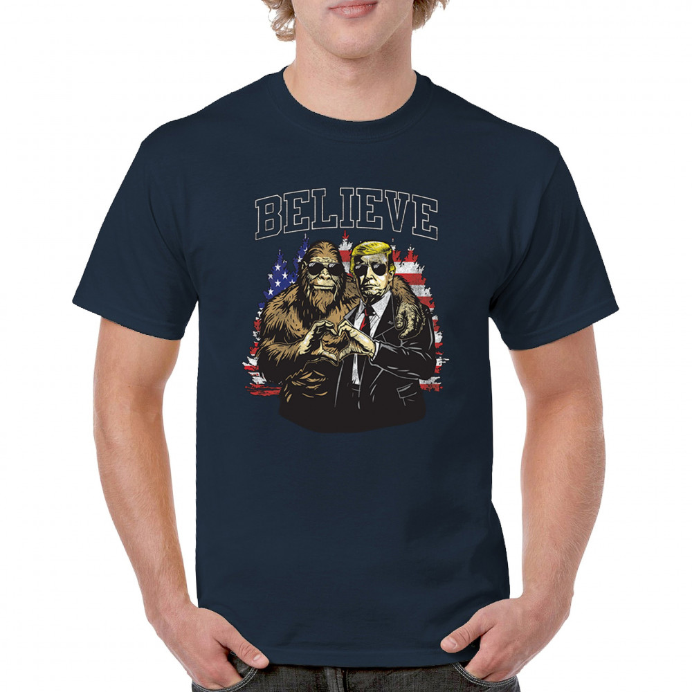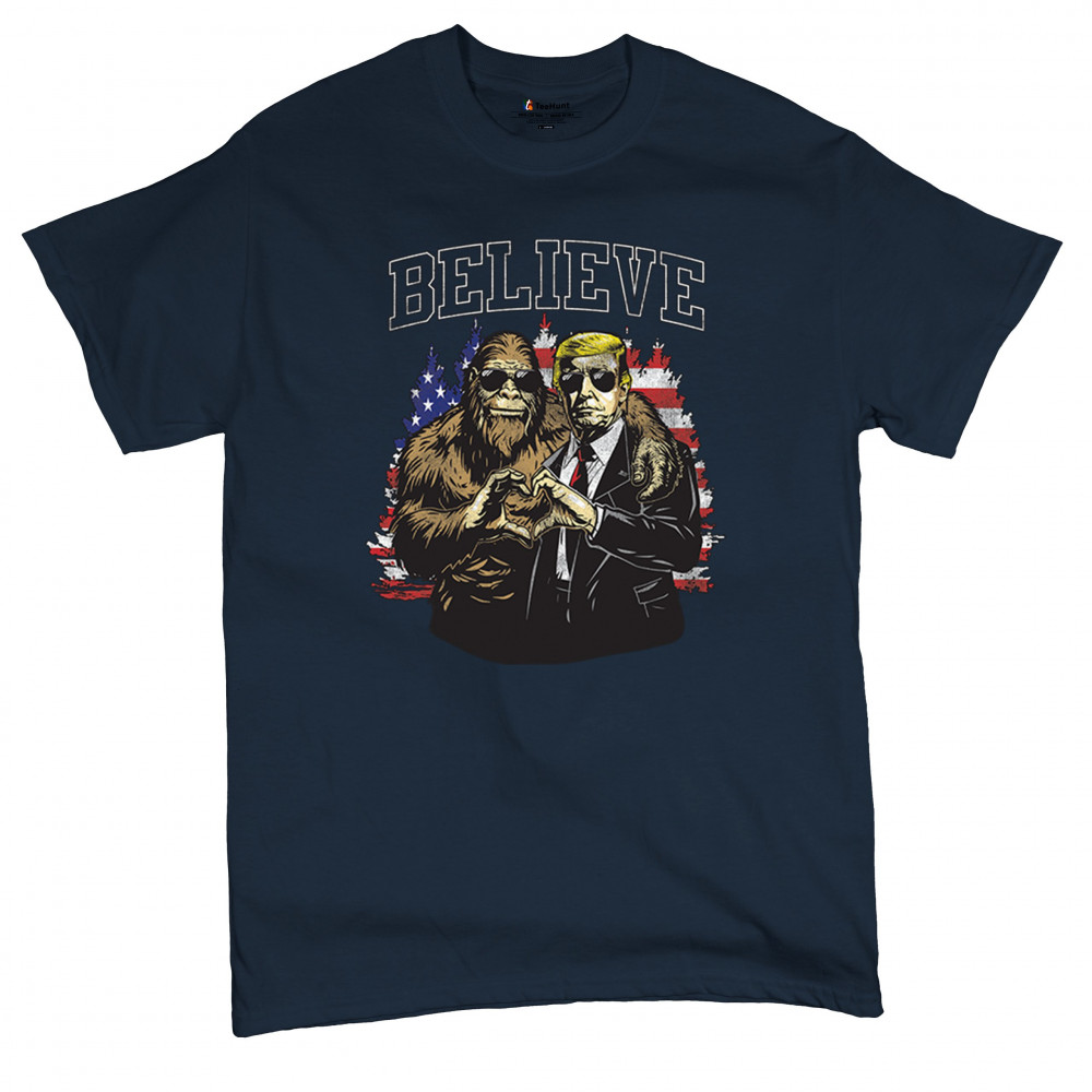 The "Believe" design combines patriotic pride and conservative values with a touch of fun. Featuring Donald J. Trump and a loyal Bigfoot against the American flag, this graphic is perfect for Trump supporters, Republicans, and believers in America First. Celebrate the Red Wave, the 47th President, and the unstoppable fight for victory. Ideal for anyone with unwavering belief in the people's mandate.