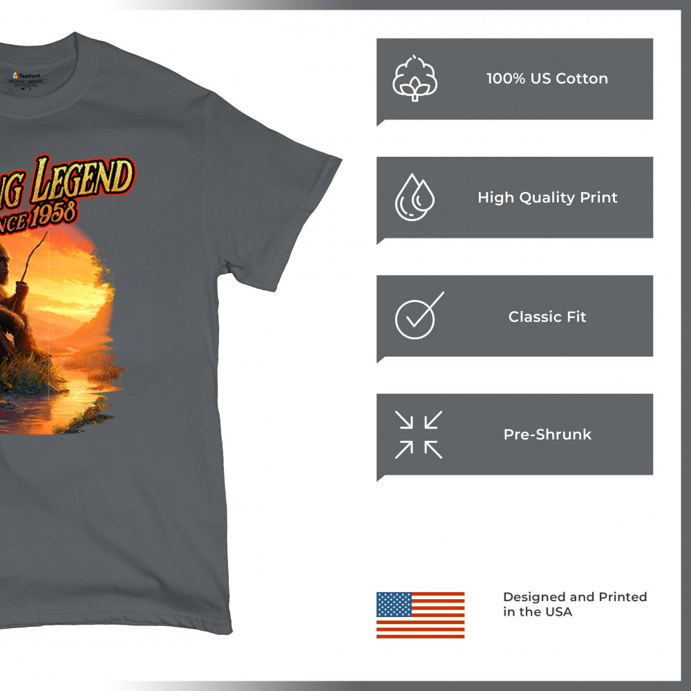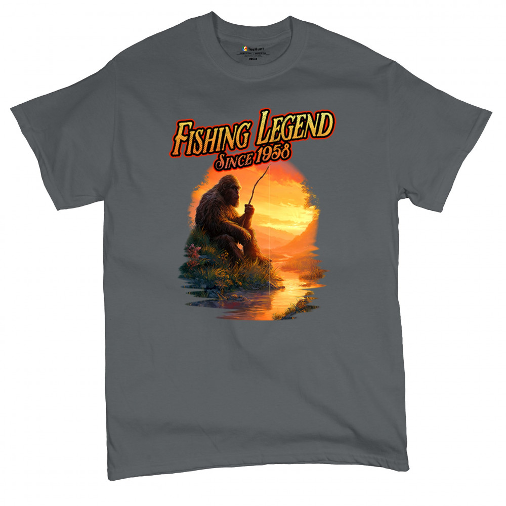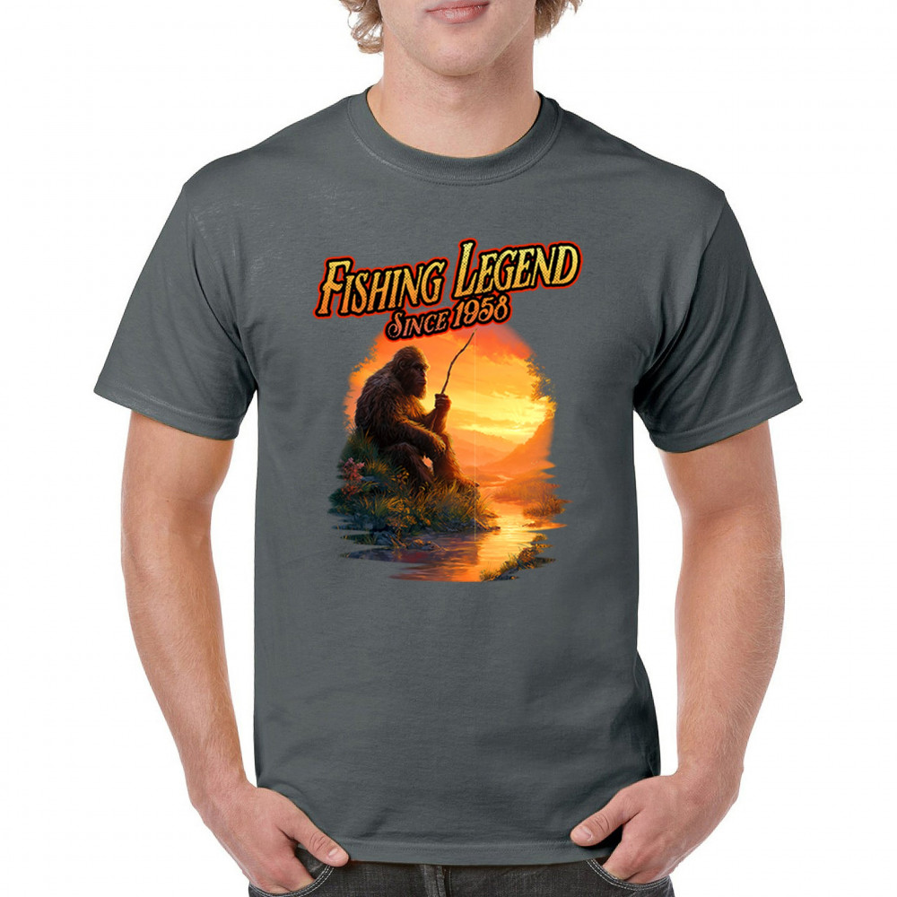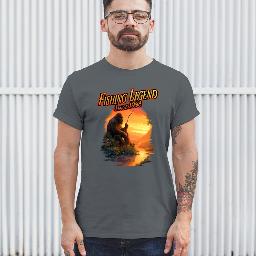 Bigfoot fishing legend design with Sasquatch lifestyle, retro vintage humor, funny wilderness shirt, Father’s Day gift, and campfire style.