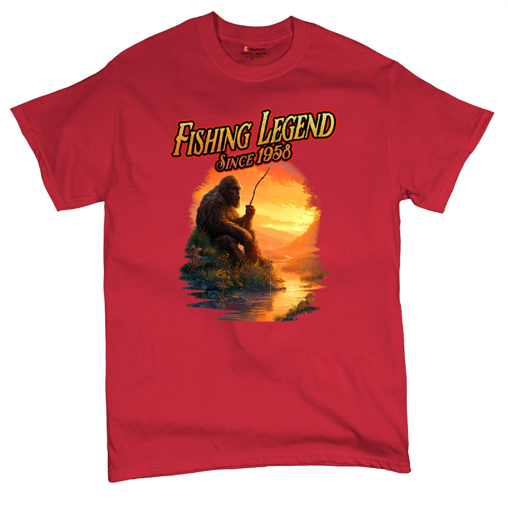 Bigfoot fishing legend design with Sasquatch lifestyle, retro vintage humor, funny wilderness shirt, Father’s Day gift, and campfire style.